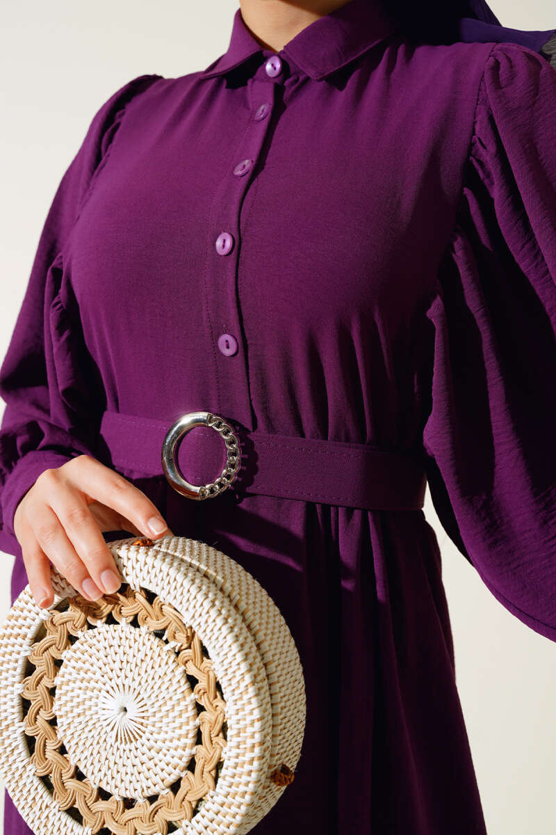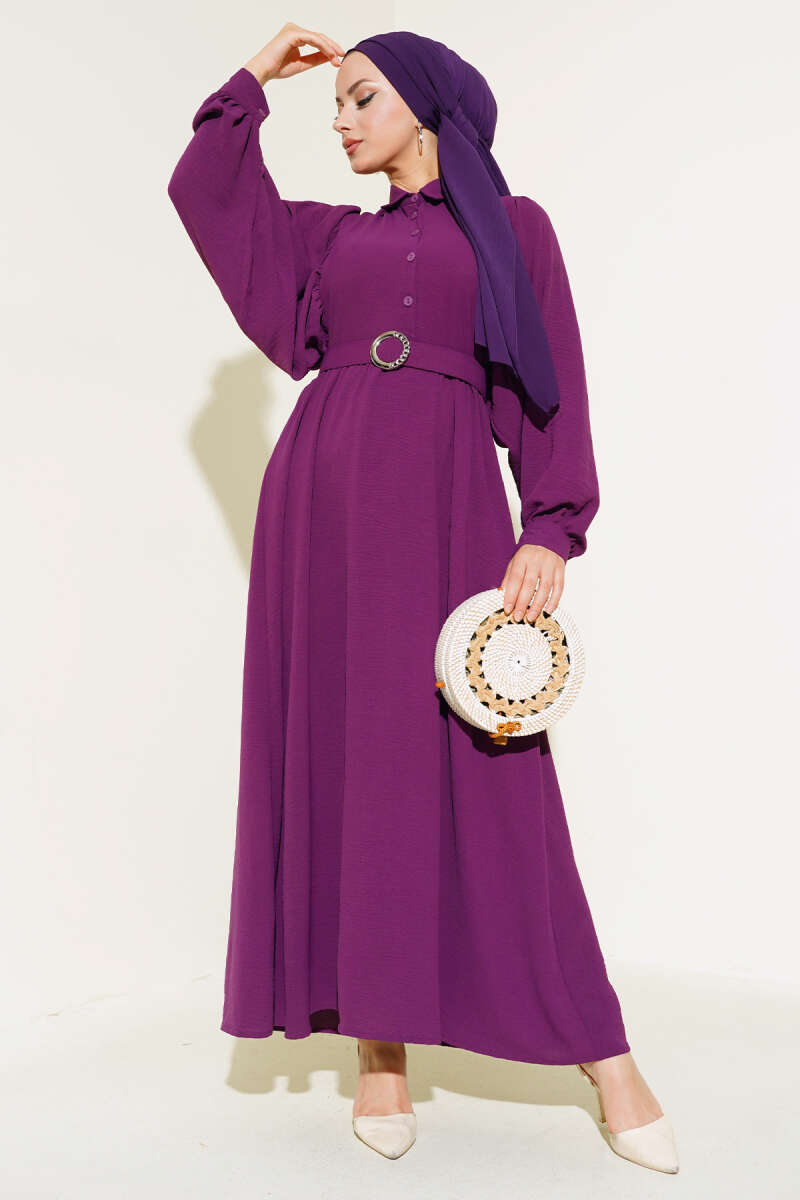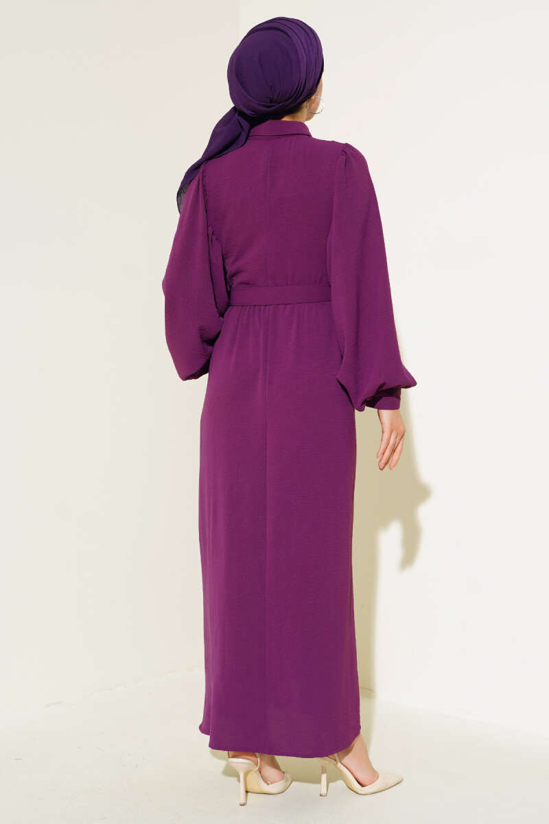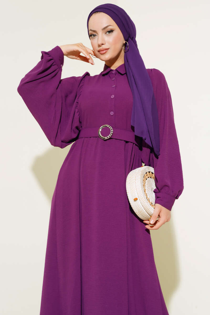 Kolları Fiyonk Detaylı Selanik Elbise Mürdüm