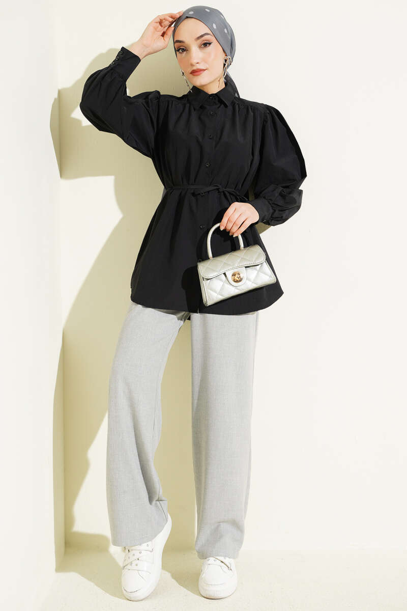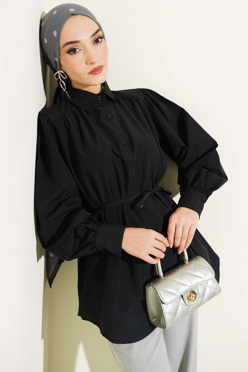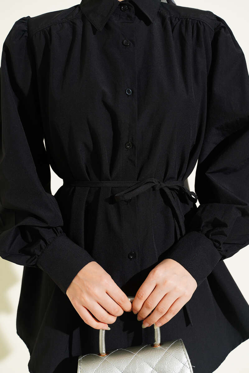 Modern ve şık bir görünüm sunan bu gömlek tunik, hafif dökümlü yapısı ve belden bağlama detayıyla vücut formunu zarifçe vurguluyor. Omuz ve manşet kısımlarındaki büzgü detayları tasarıma hareket katarken, düğmeli manşetler klasik bir dokunuş sağlıyor.