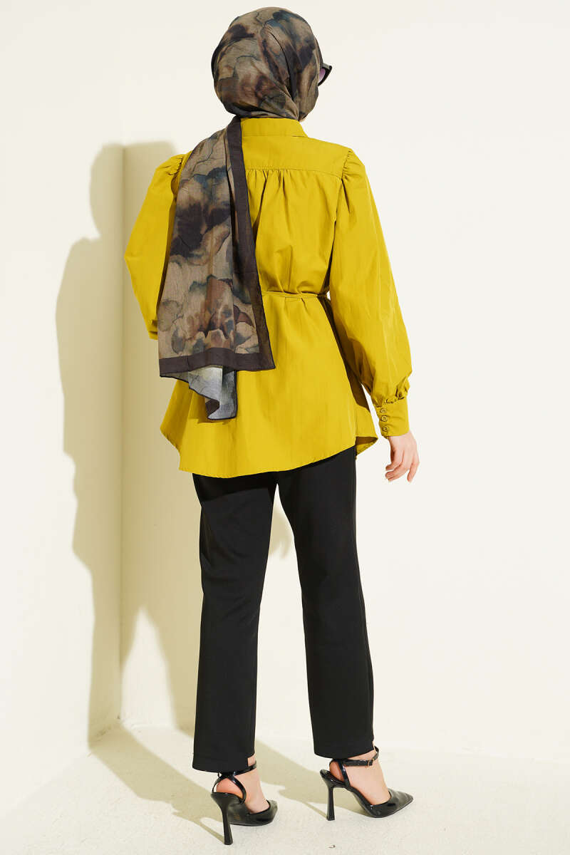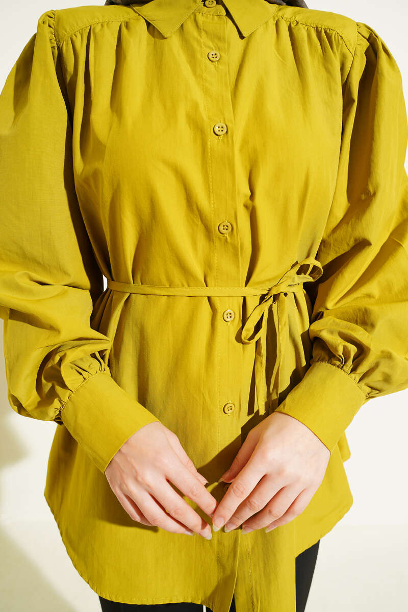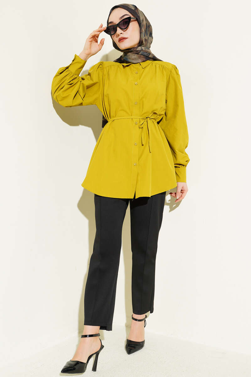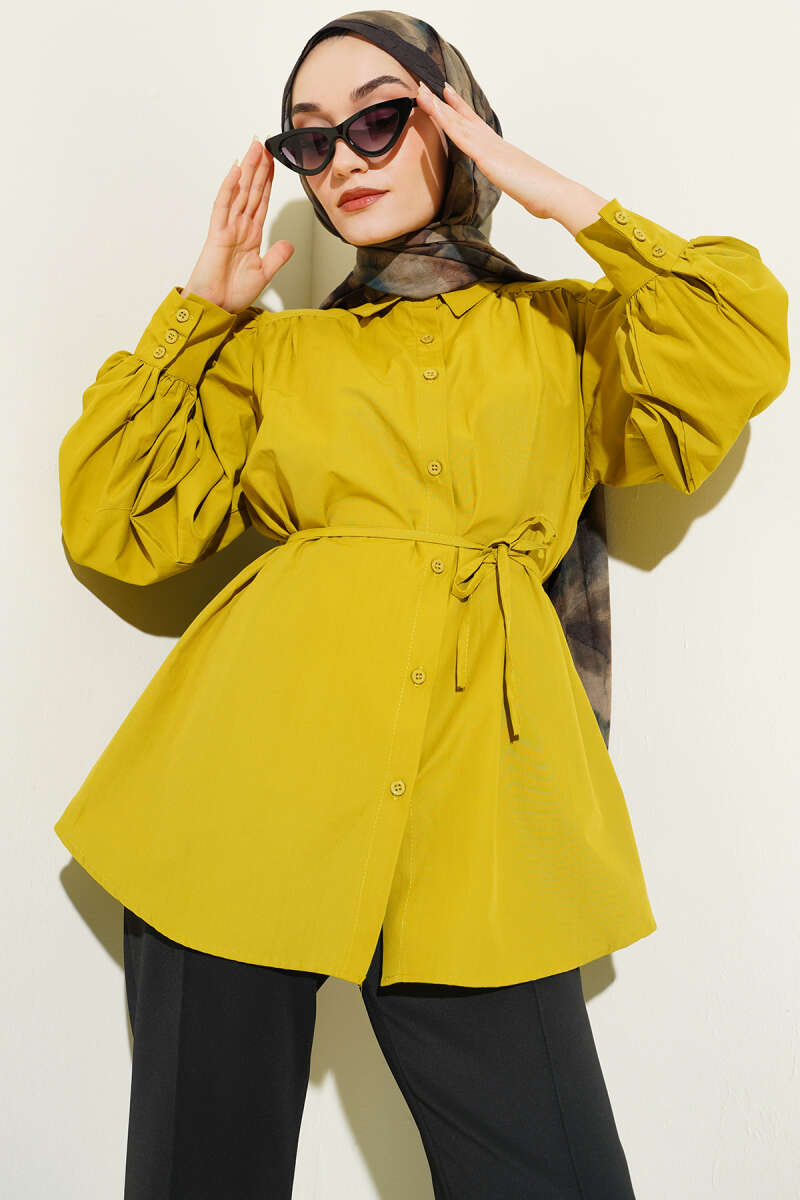 Modern ve şık bir görünüm sunan bu gömlek tunik, hafif dökümlü yapısı ve belden bağlama detayıyla vücut formunu zarifçe vurguluyor. Omuz ve manşet kısımlarındaki büzgü detayları tasarıma hareket katarken, düğmeli manşetler klasik bir dokunuş sağlıyor.