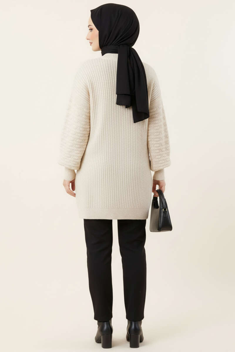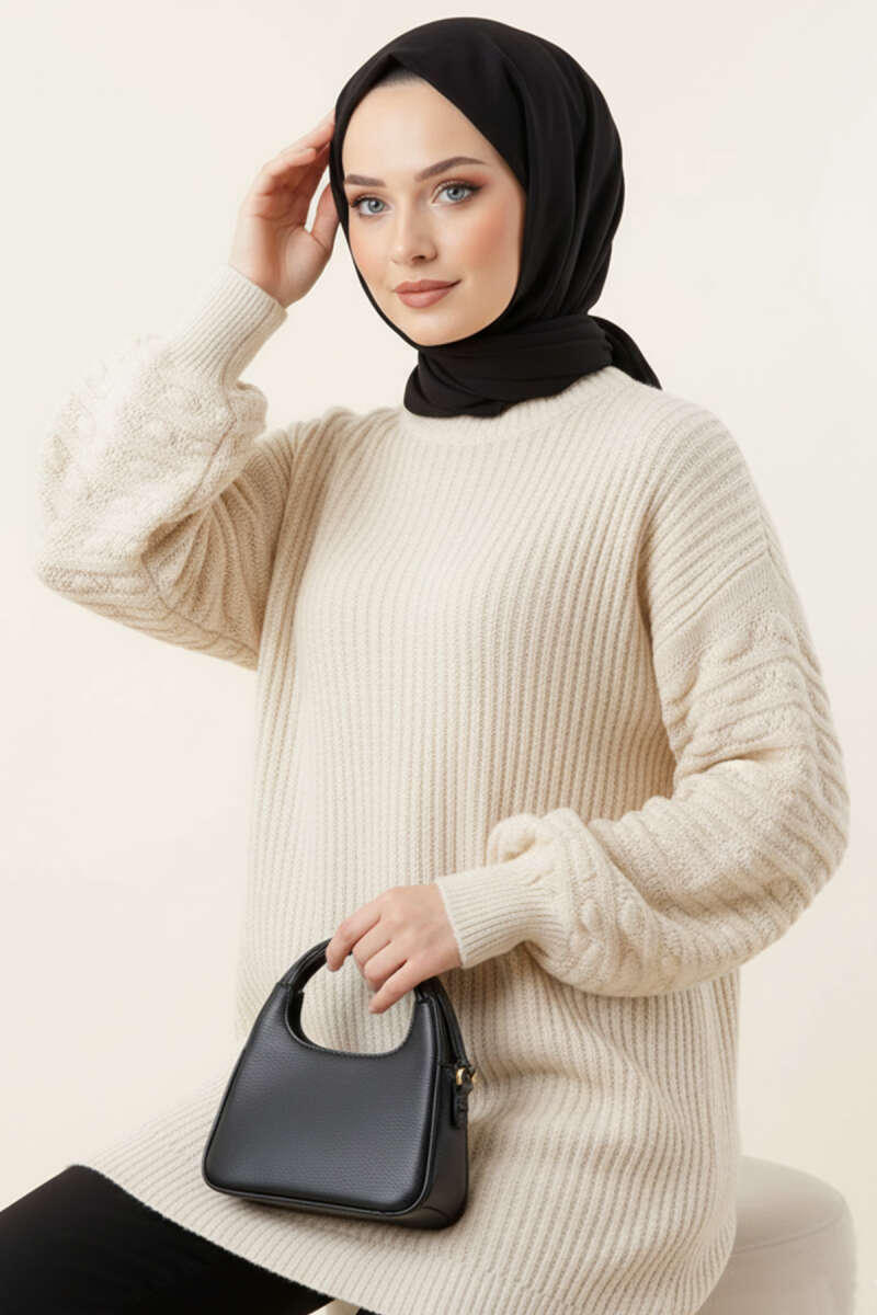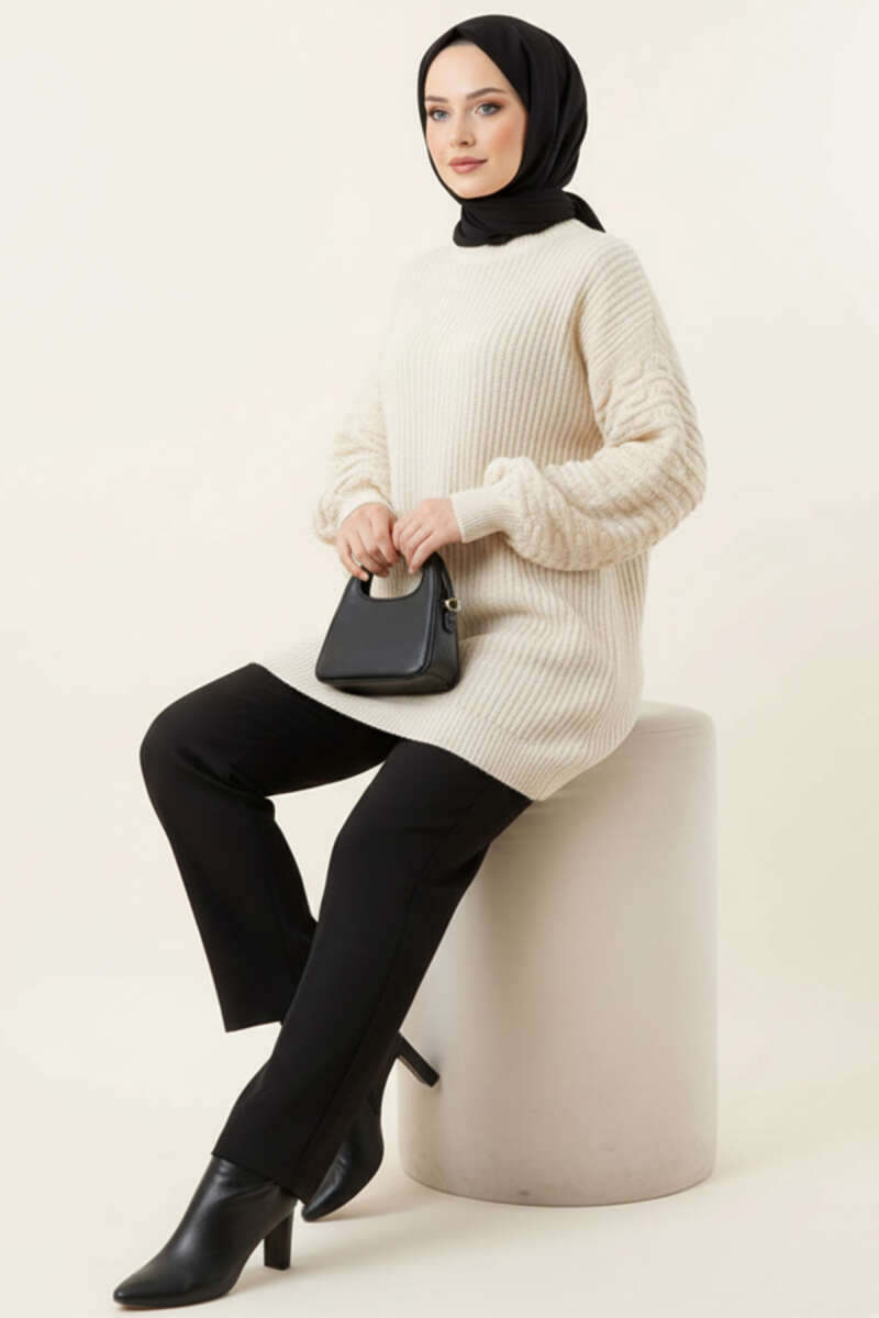 Balon Kol Kabartmalı Triko Tunik Ekru
