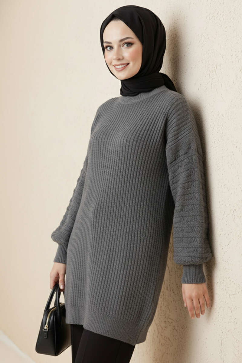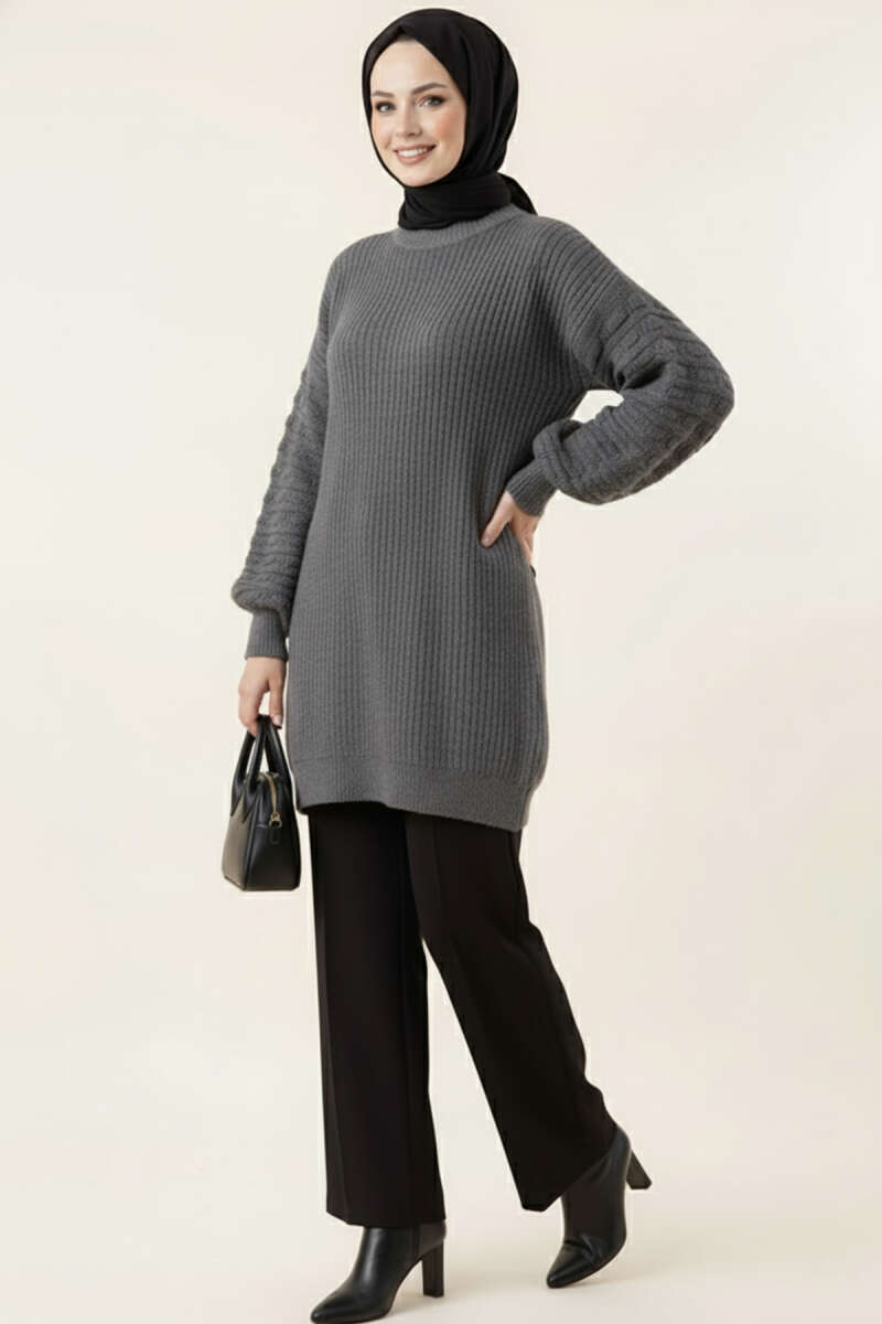 Balon Kol Kabartmalı Triko Tunik Bordo