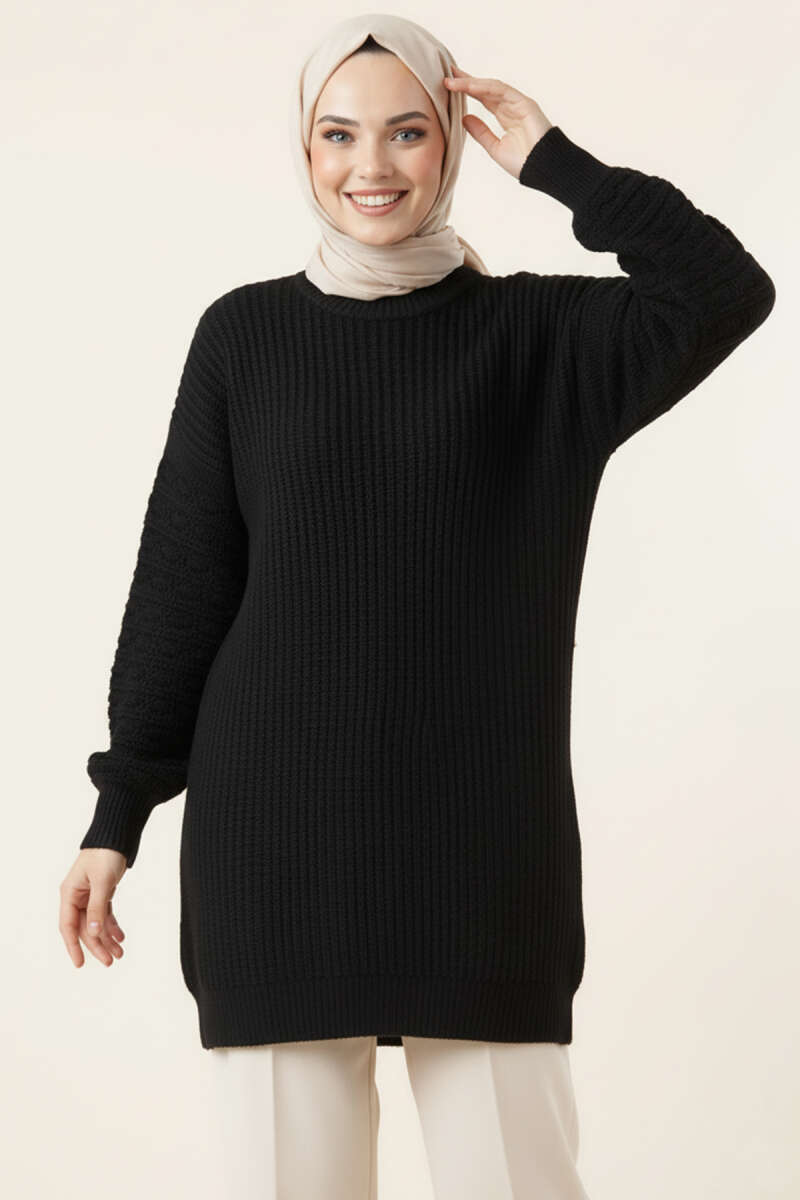 Balon Kol Kabartmalı Triko Tunik Siyah