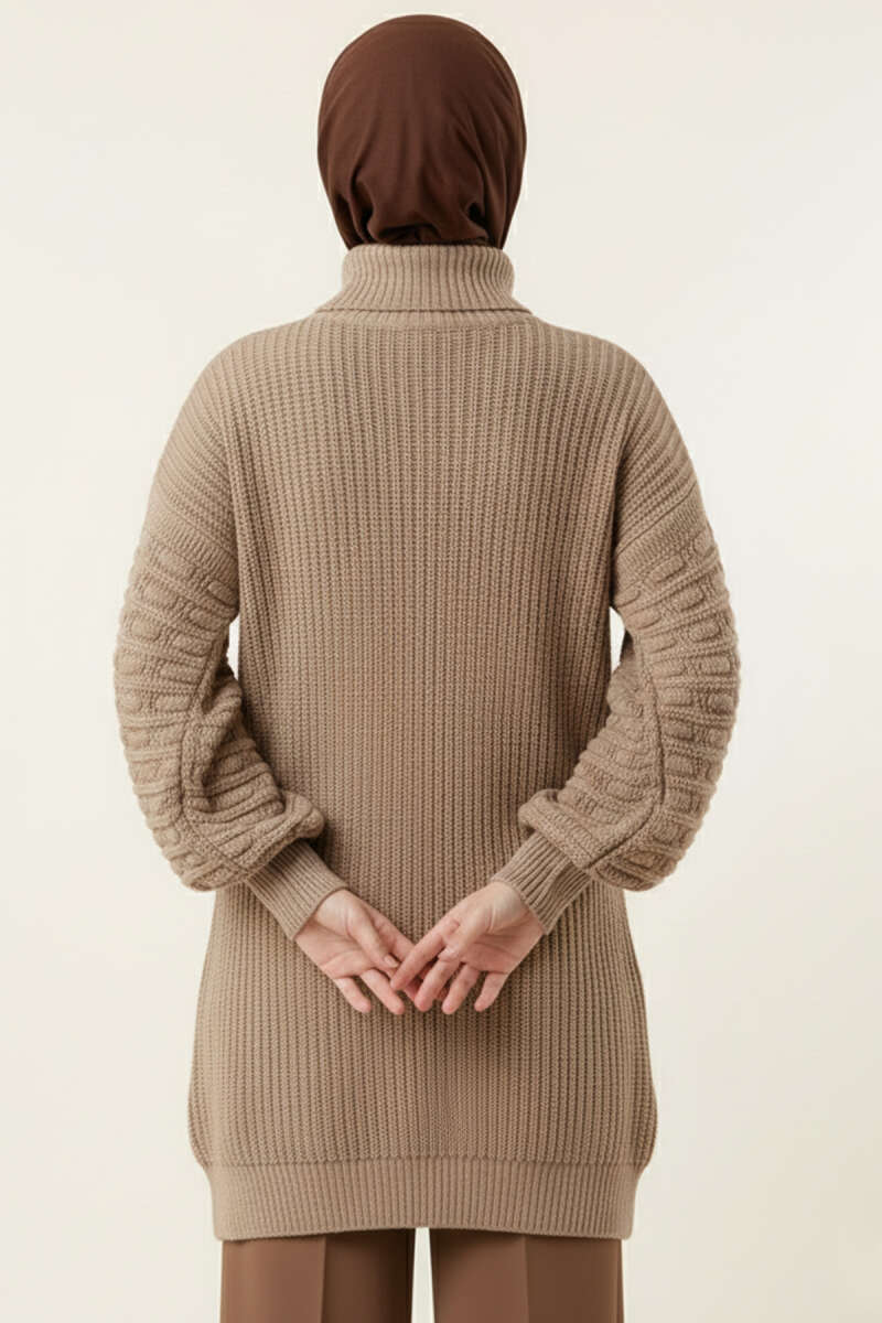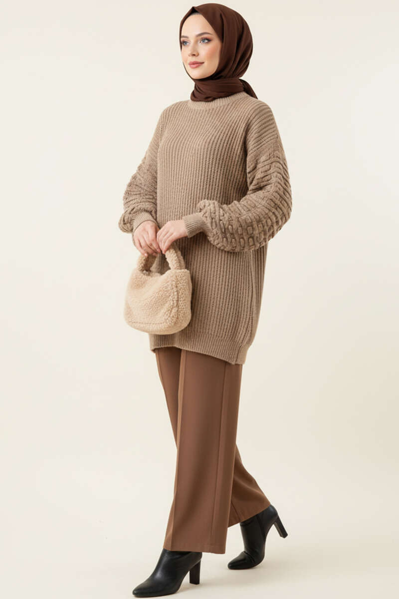 Balon Kol Kabartmalı Triko Tunik Kahve