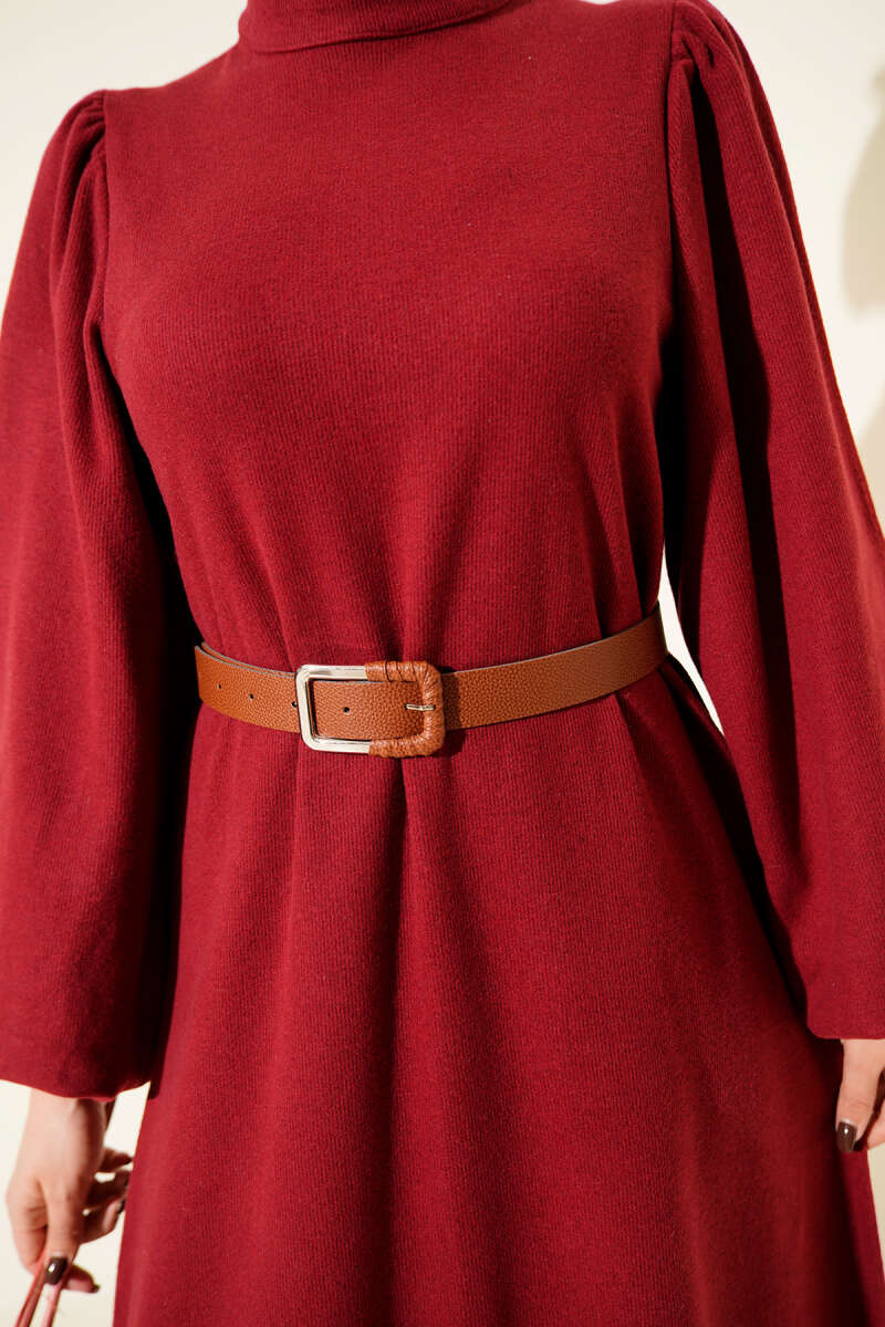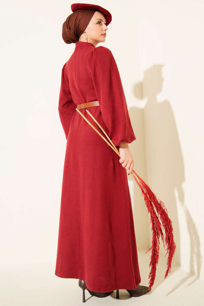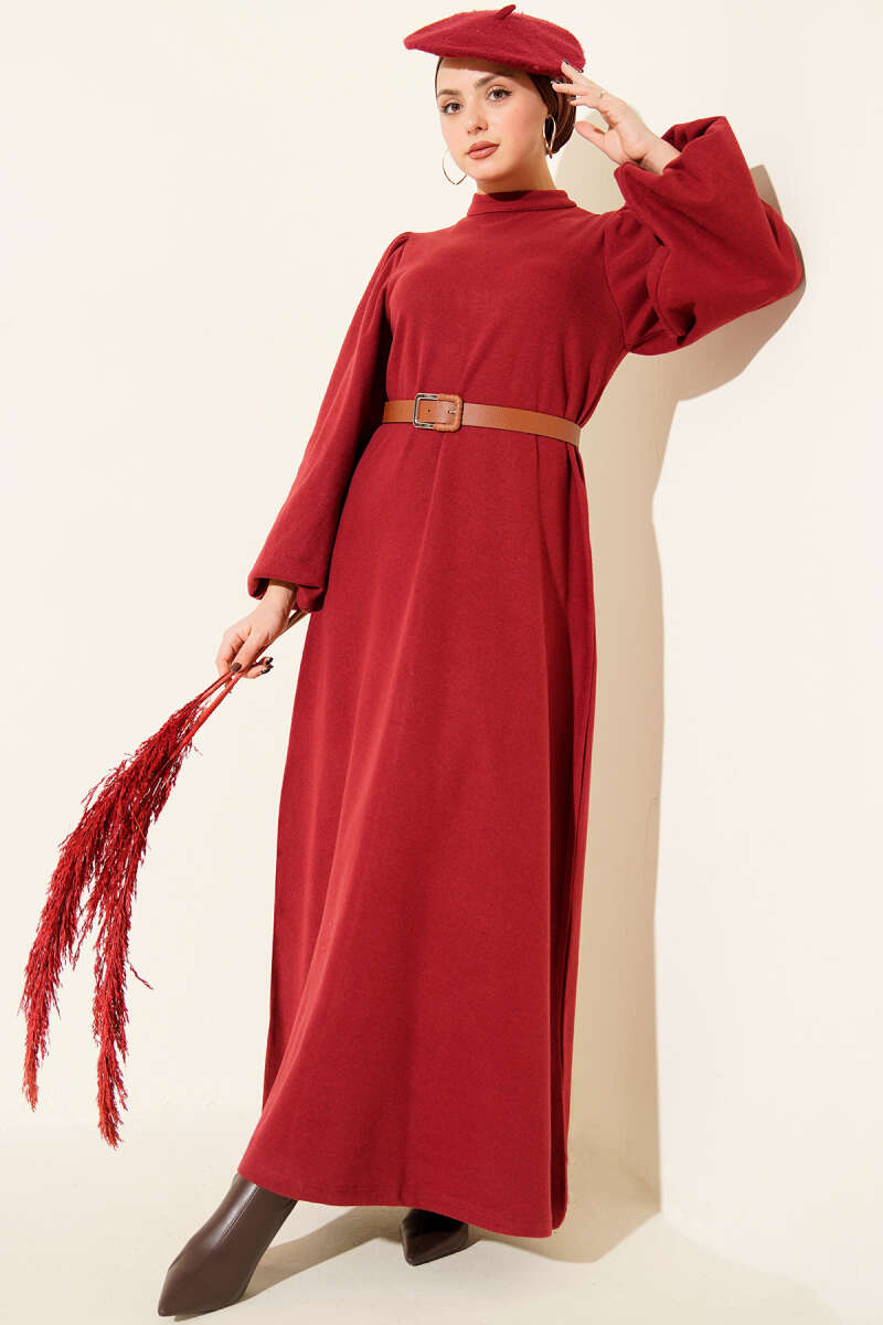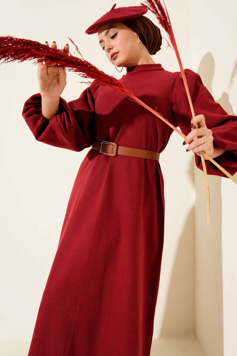 Balon Kol Kemerli Basic Elbise Bordo