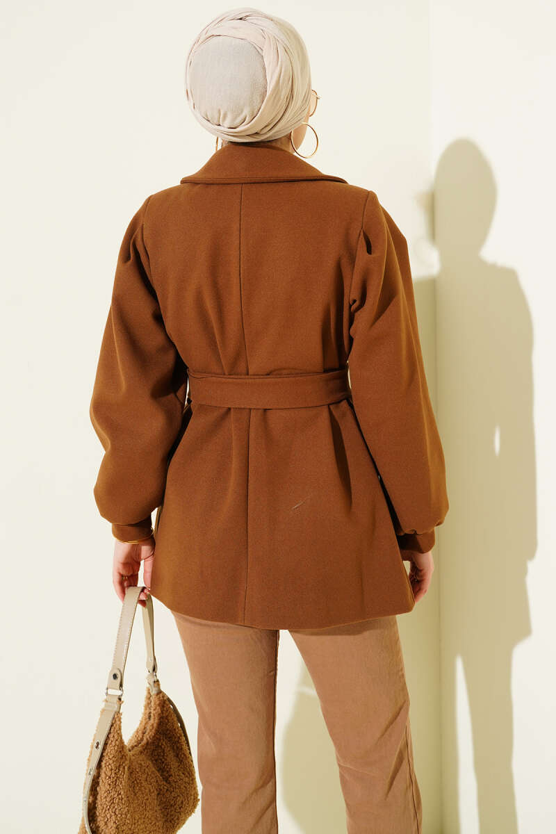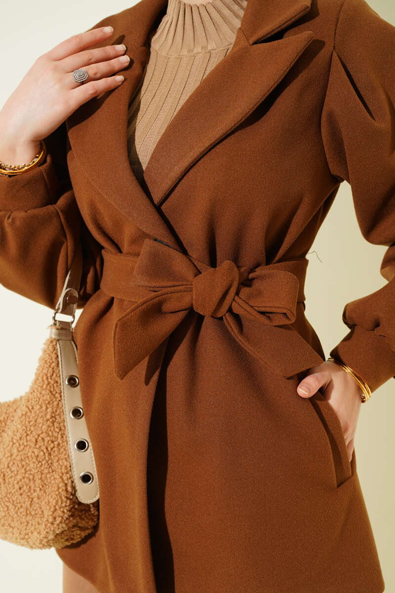 Kruvaze Yakalı Kuşaklı Uzun Kaşe Kaban Kahve