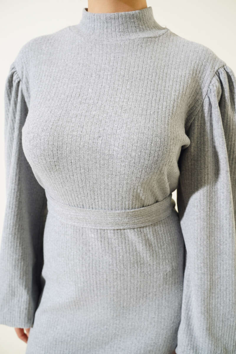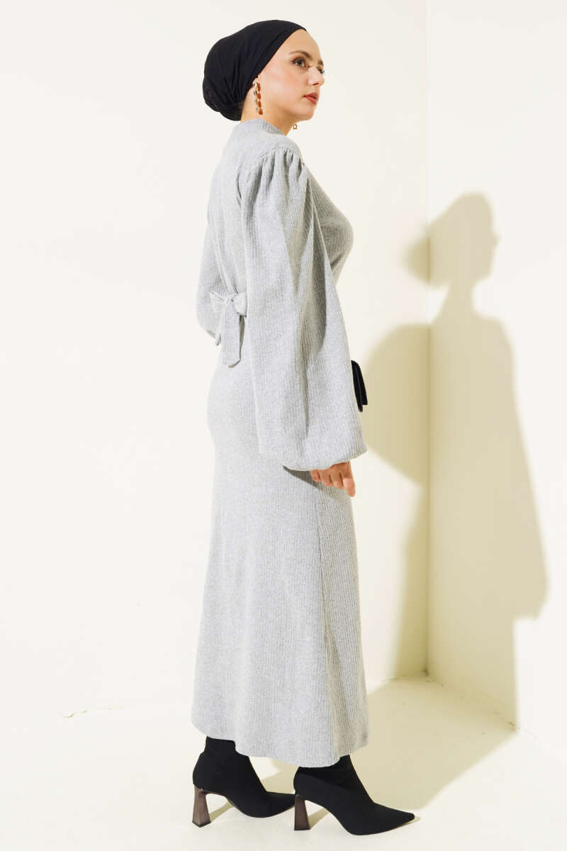 Çizgi Gömlek Garnili Triko Elbise Füme