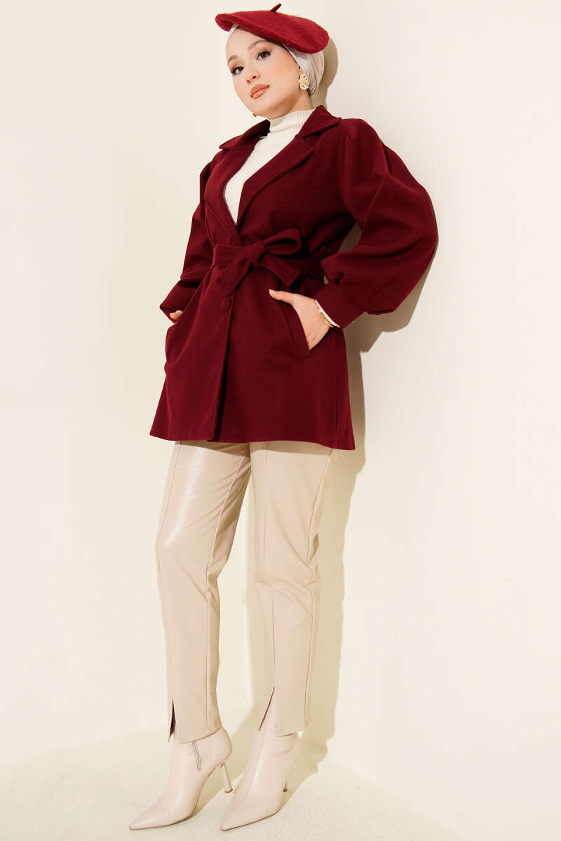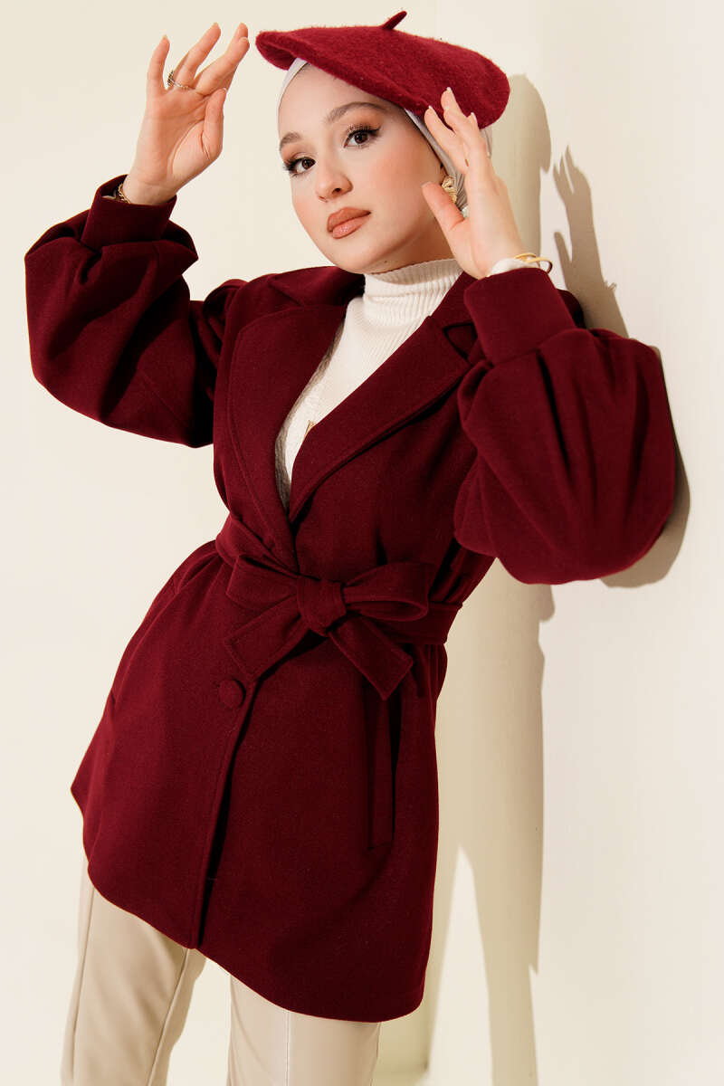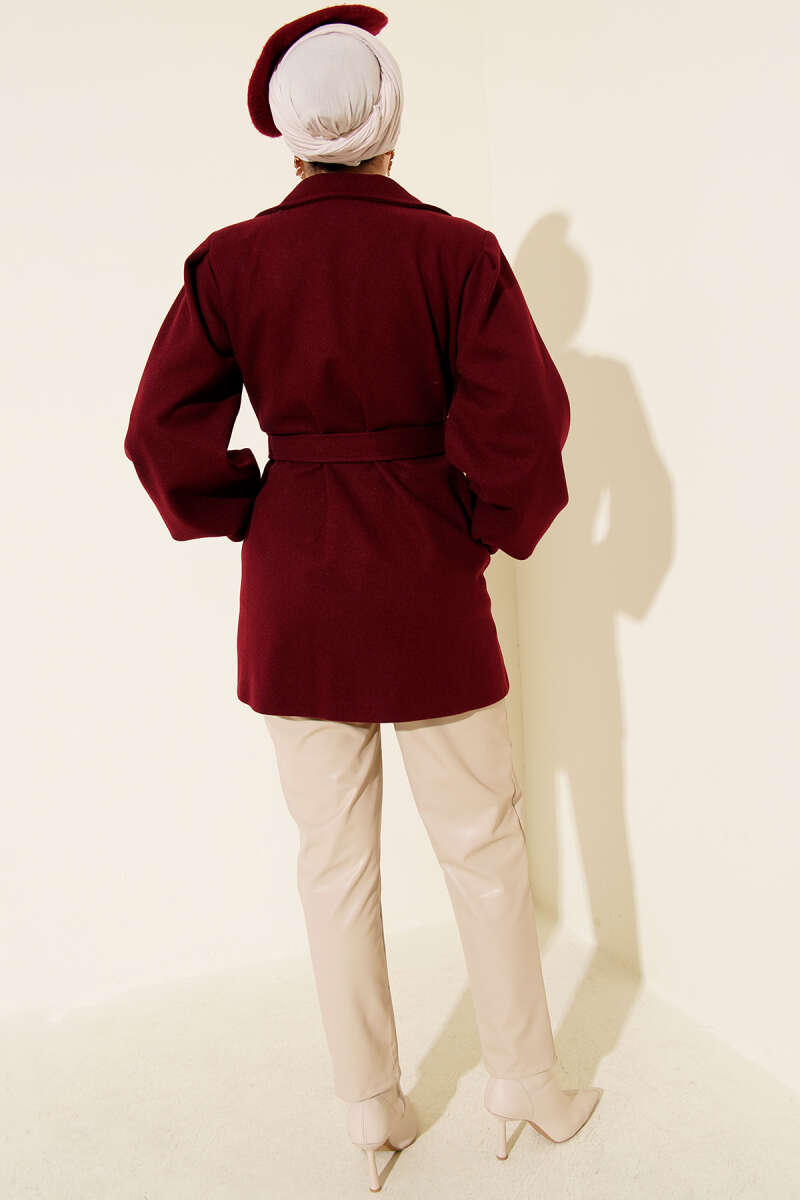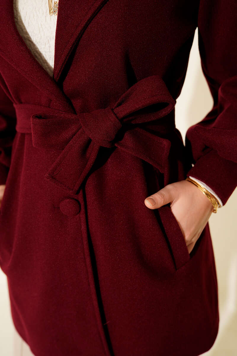 Çift Cepli Kruvaze Kuşaklı Kısa Kaban Bordo