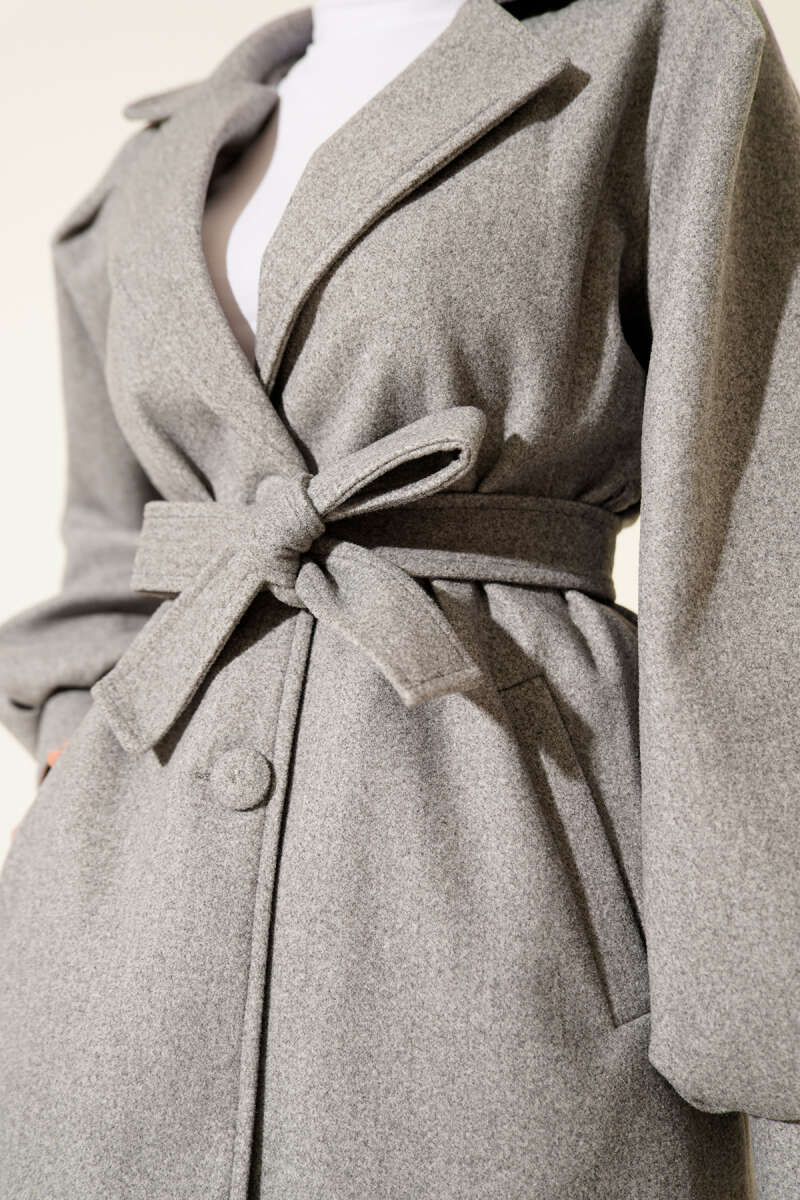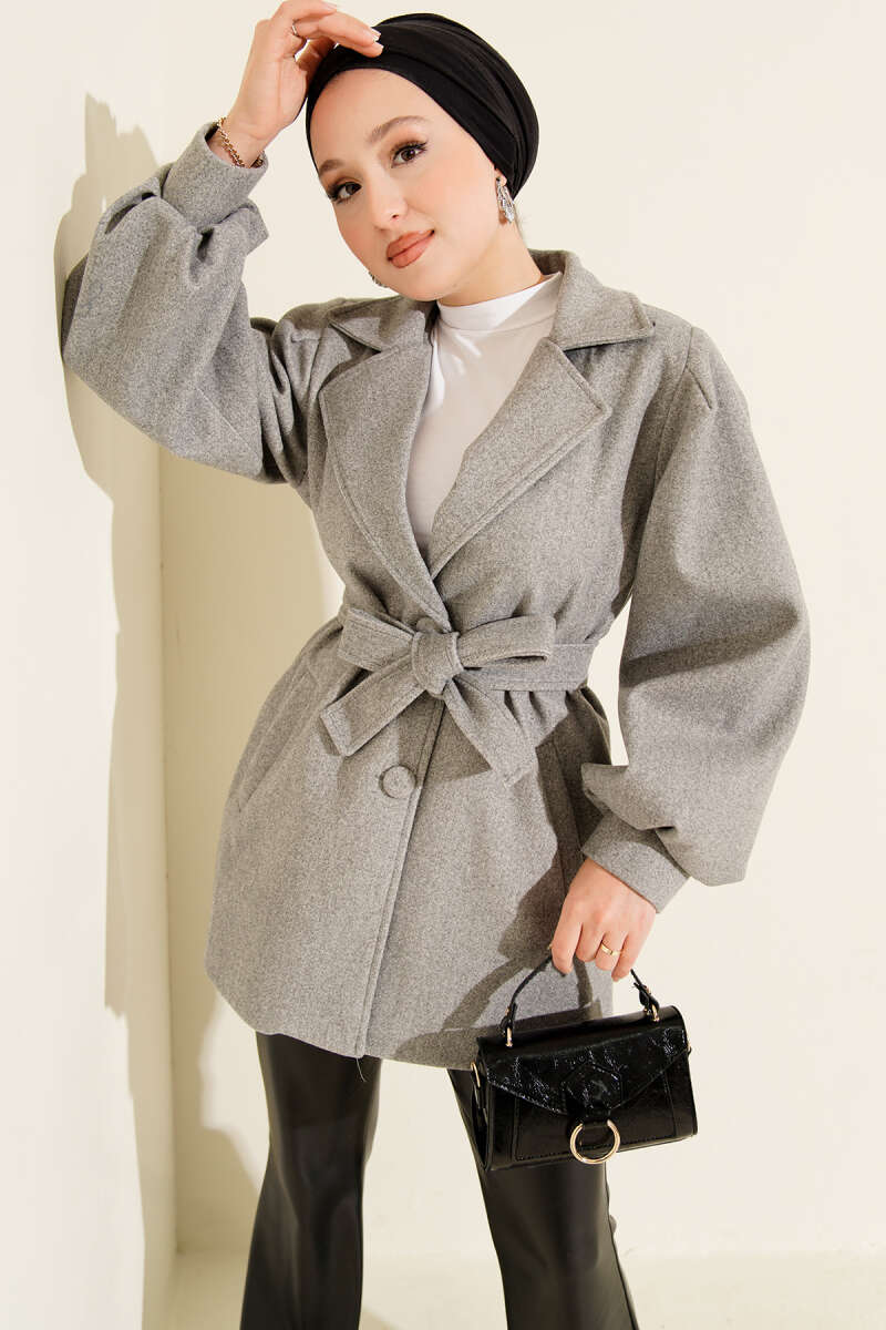 Çift Cepli Kruvaze Kuşaklı Kısa Kaban Gri