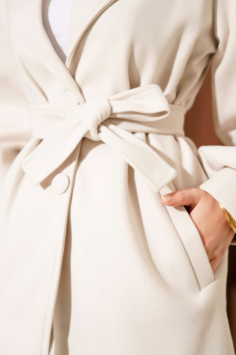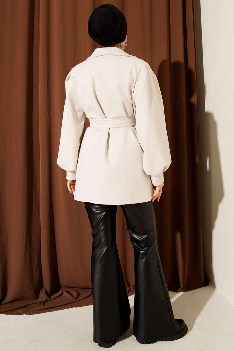 Kruvaze Yaka Balon Kol Kuşaklı Kaban Bej