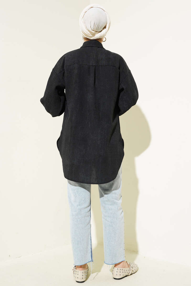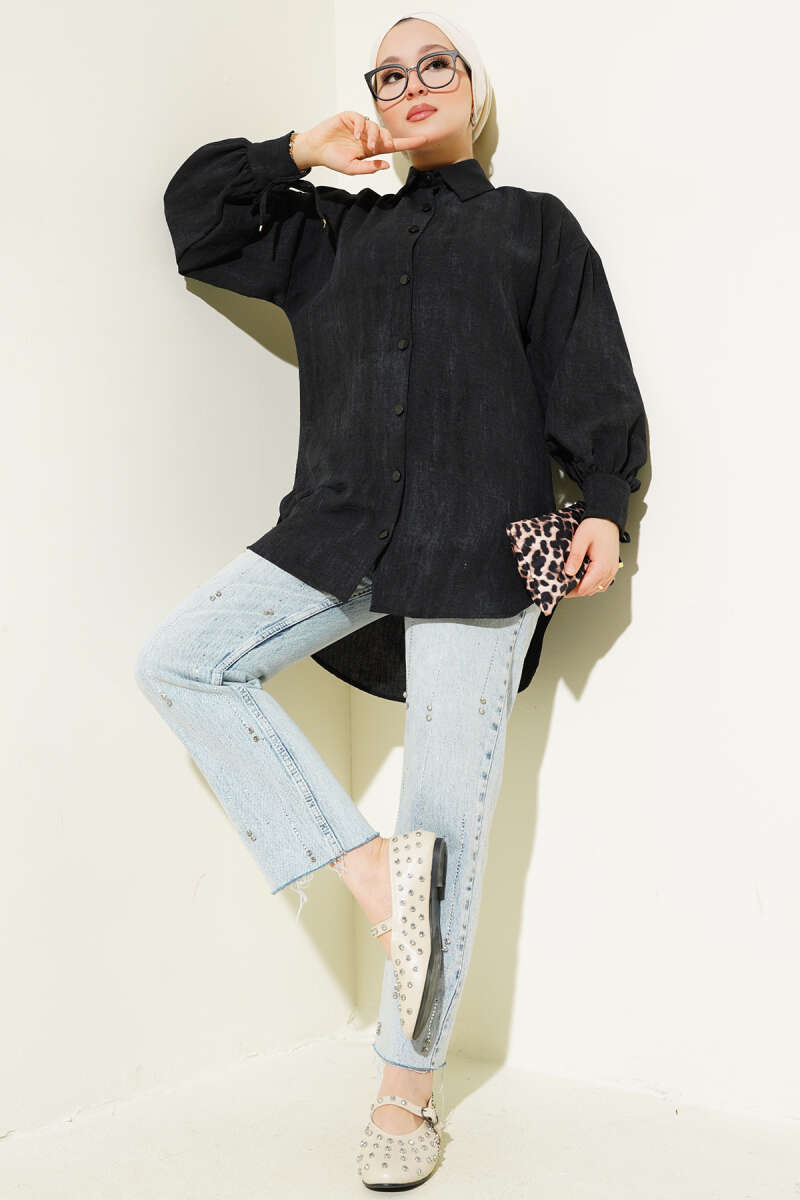 Balon Kol Manşet Bağcıklı Gömlek Siyah