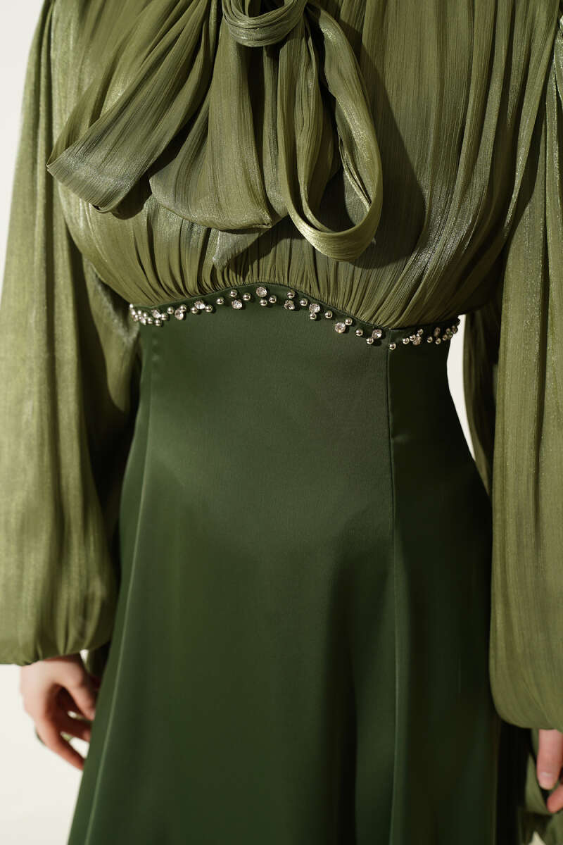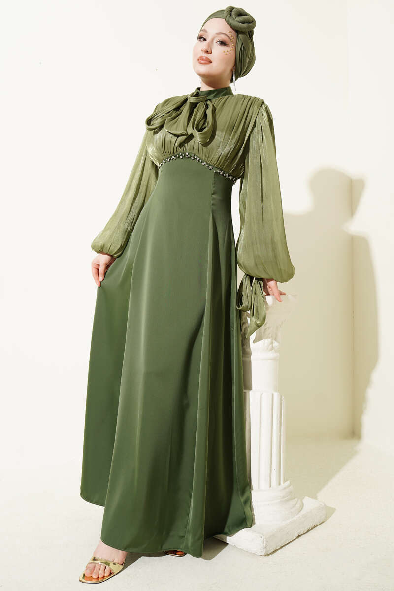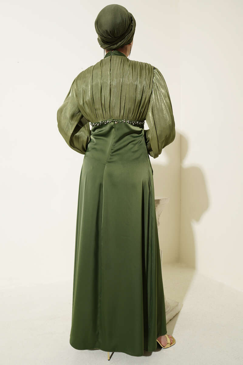 Taş Süslemeli Manşet Düğmeli Abiye Elbise Haki