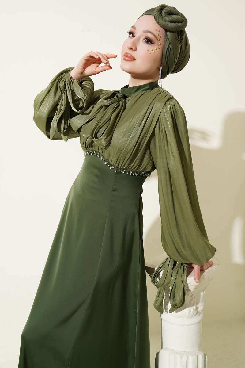 Balon Kol Mini Taşlı Abiye Elbise Haki