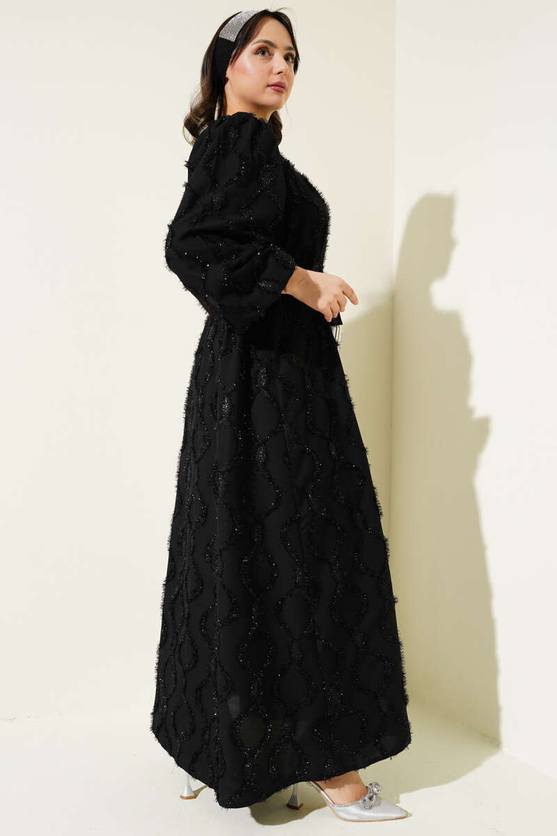 Çiçek Motifli Tül Pelerinli Abiye Elbise Siyah