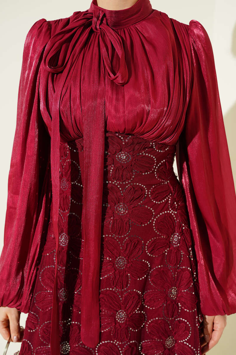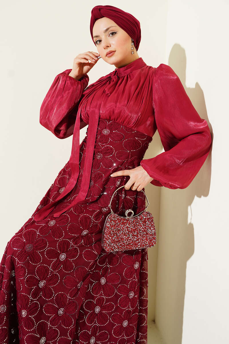 Balon Kol Pul Çiçekli Abiye Elbise Gül Kurusu