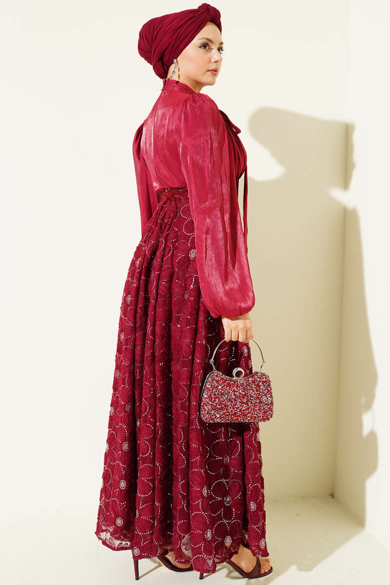 Gold Tokalı Pensli Tensel Elbise Bordo