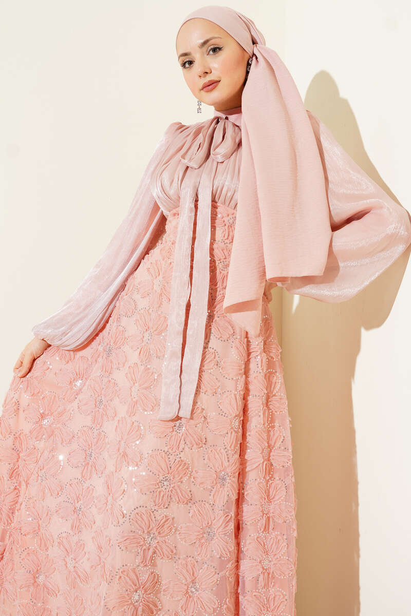 Balon Kol Pul Çiçekli Abiye Elbise Siyah