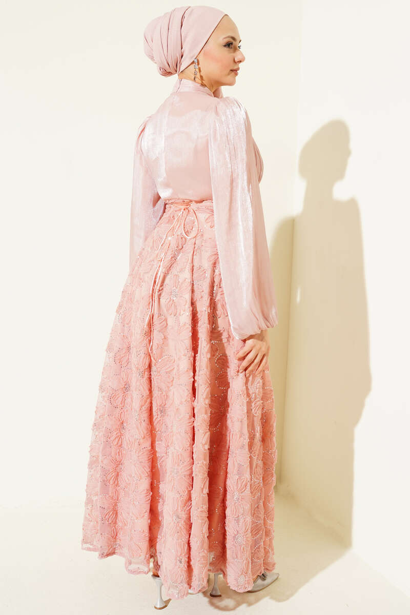 Balon Kol Pul Çiçekli Abiye Elbise Bordo