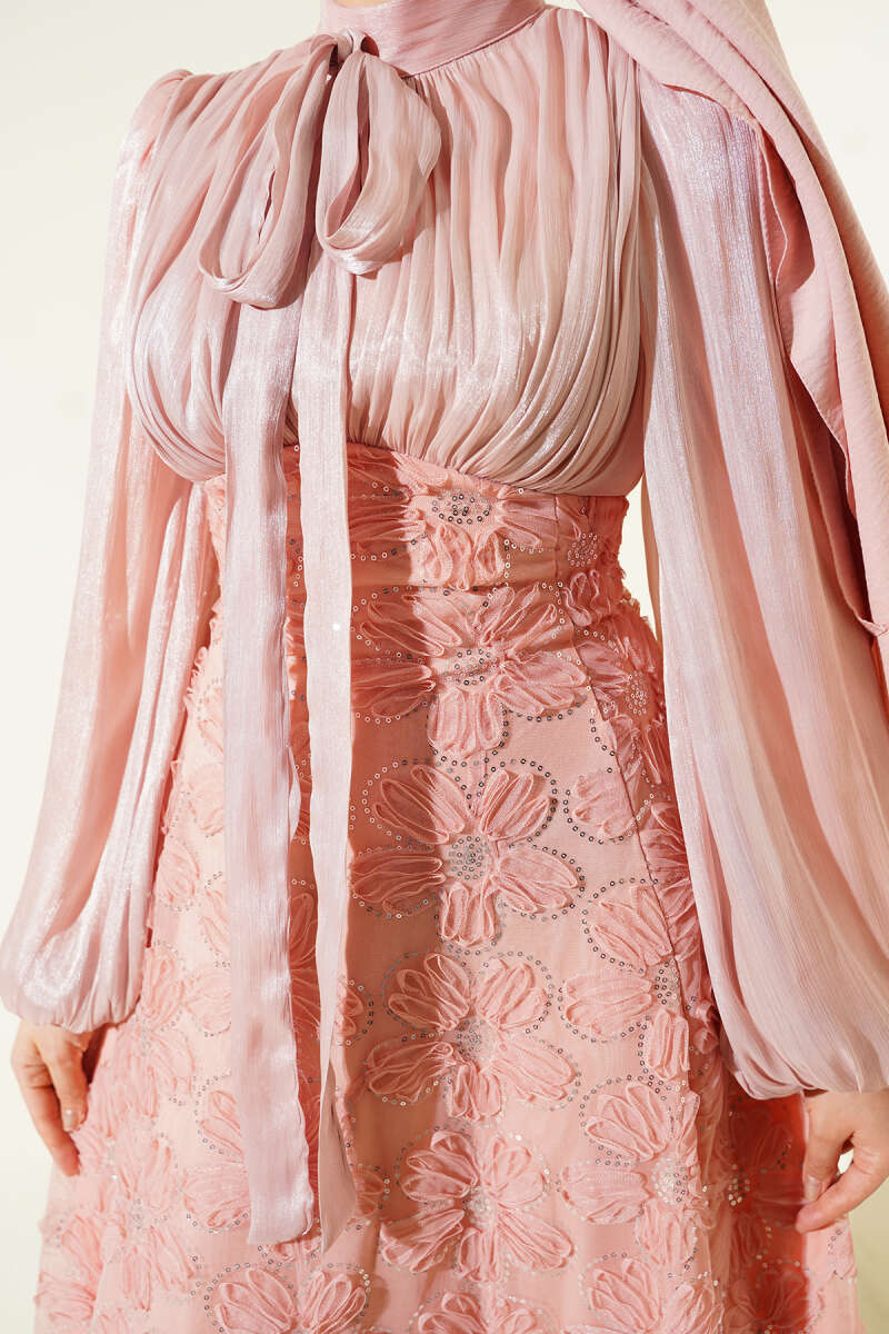 Balon Kol Pul Çiçekli Abiye Elbise İndigo