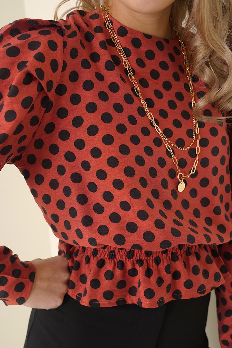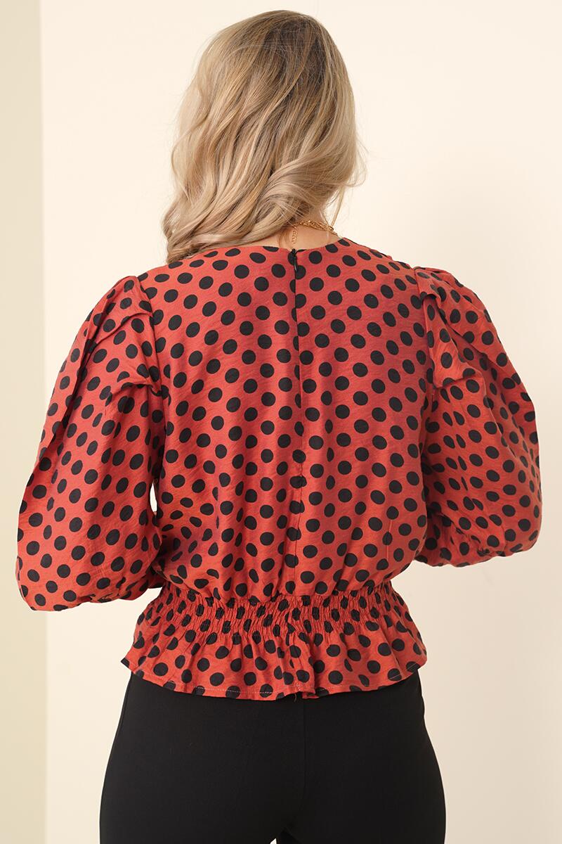 Puantiye desenli yeni sezon model olan bluz kiremit renklidir. Balon kol serisine ait olan bluzun kollarında kullanmaya uygun fermuar detayı bulunmaktadır. Bisiklet yakalı olan bluzun beli esnek lastiklidir. Yumuşacık dokusu tiril tiril yapısıyla gönlünüzü feth edecek olan bluz iç göstermemektedir. Enseden fermuarlıdır. Geniş renk skalasıyla her zevke hitap etmektedir.