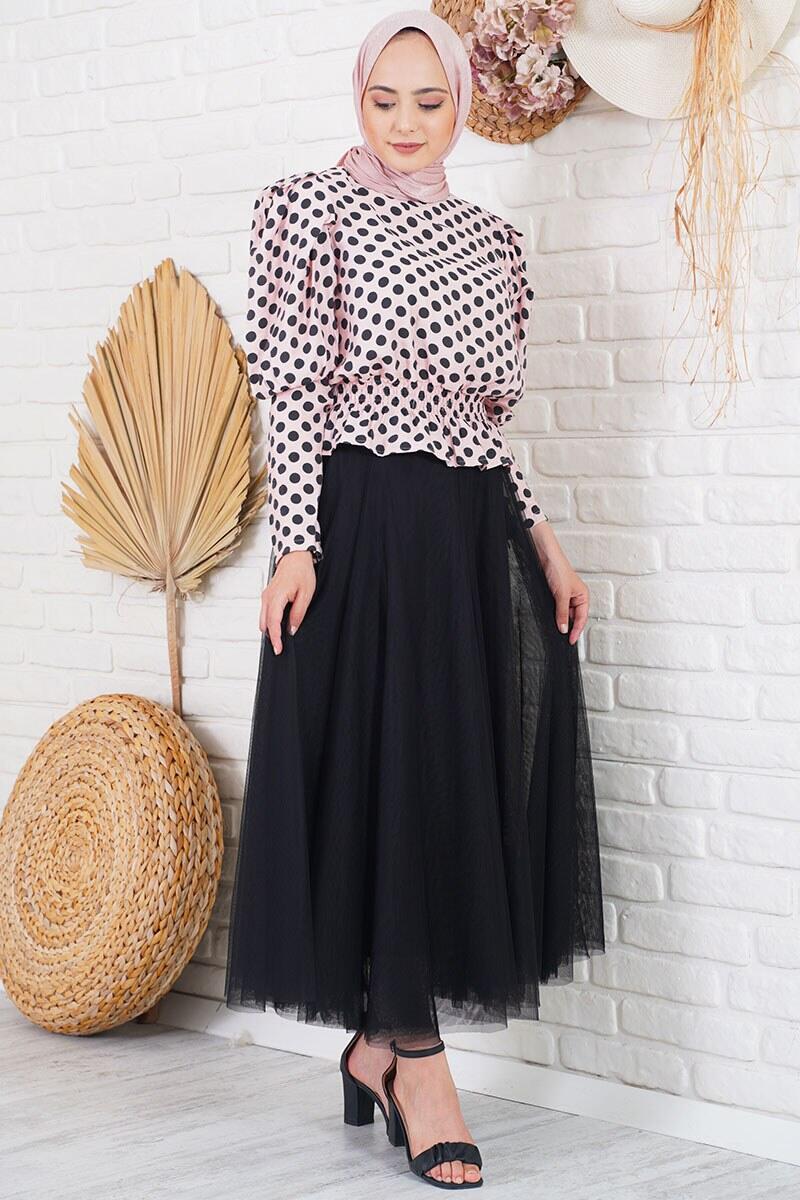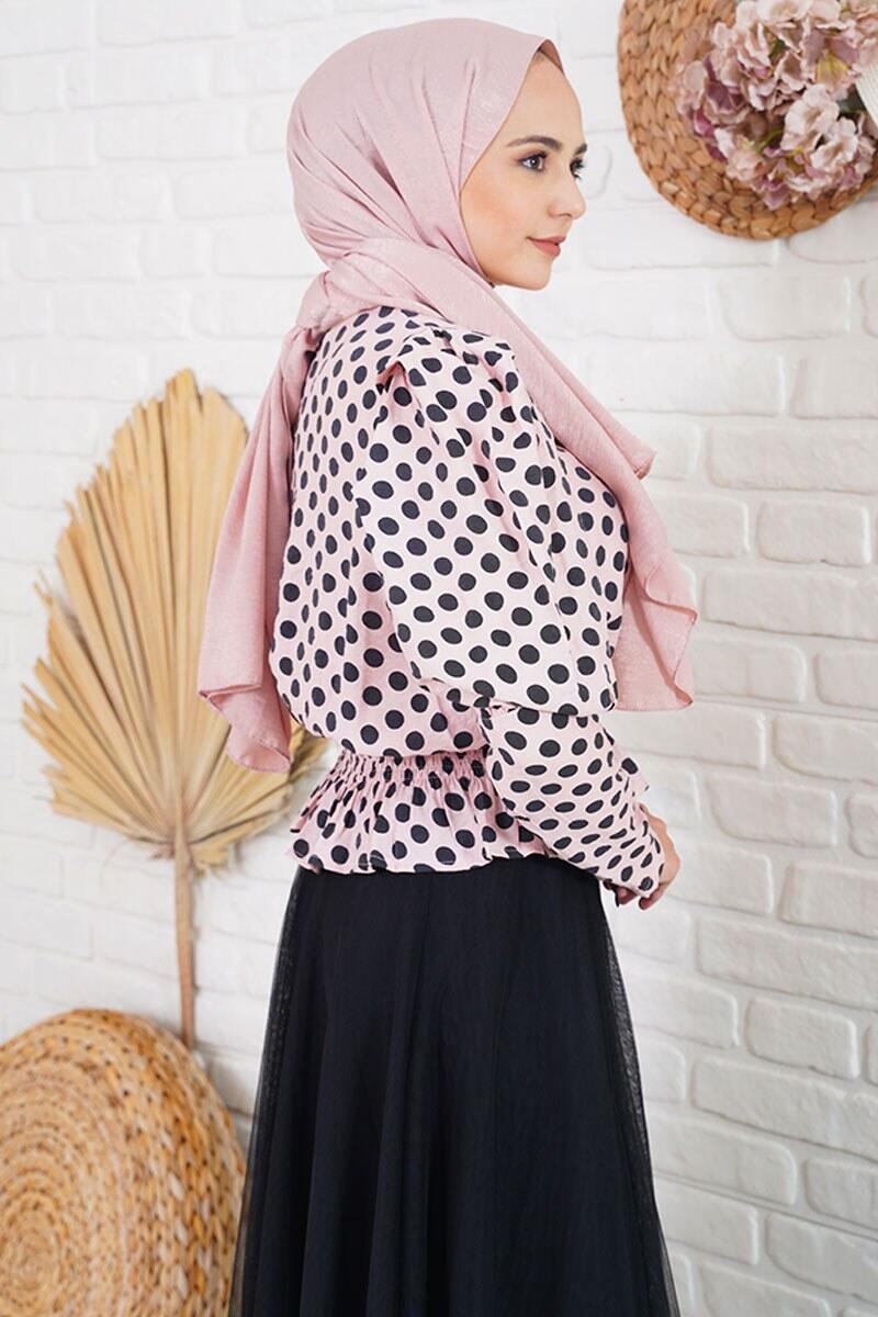 Yeni sezon model puantiye desenli bluz pembe renklidir. Bisiklet yakalı enseden fermuarlıdır. Bel kısmı esnek lastikli olan bluz yumuşacık dokuya sahip olup tiril tiril yapıdadır. Balon kol serisinden olan bluzun kollarında fermuar detayı bulunmaktadır. İç göstermeyen kumaşa sahip olan bluzun geniş renk skalasıyla buluşmaya ne dersiniz?
