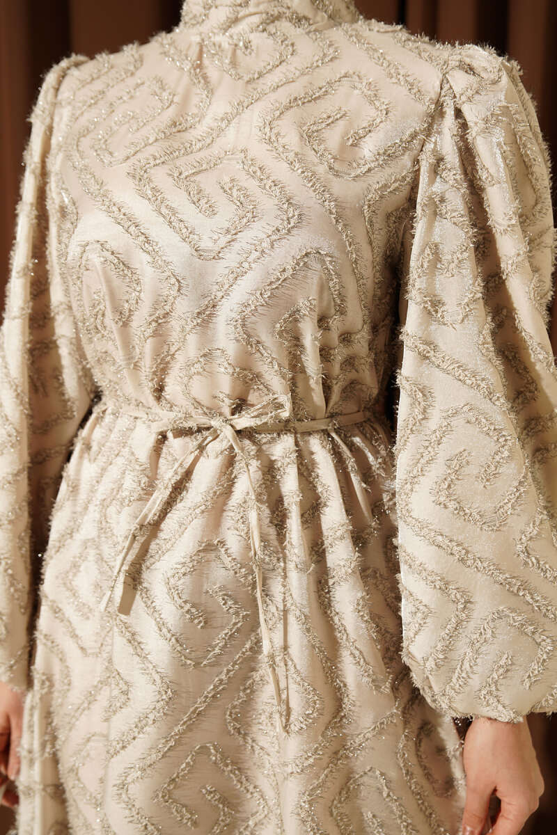 Jakarlı Yandan Bağlamalı Abiye Elbise Bej