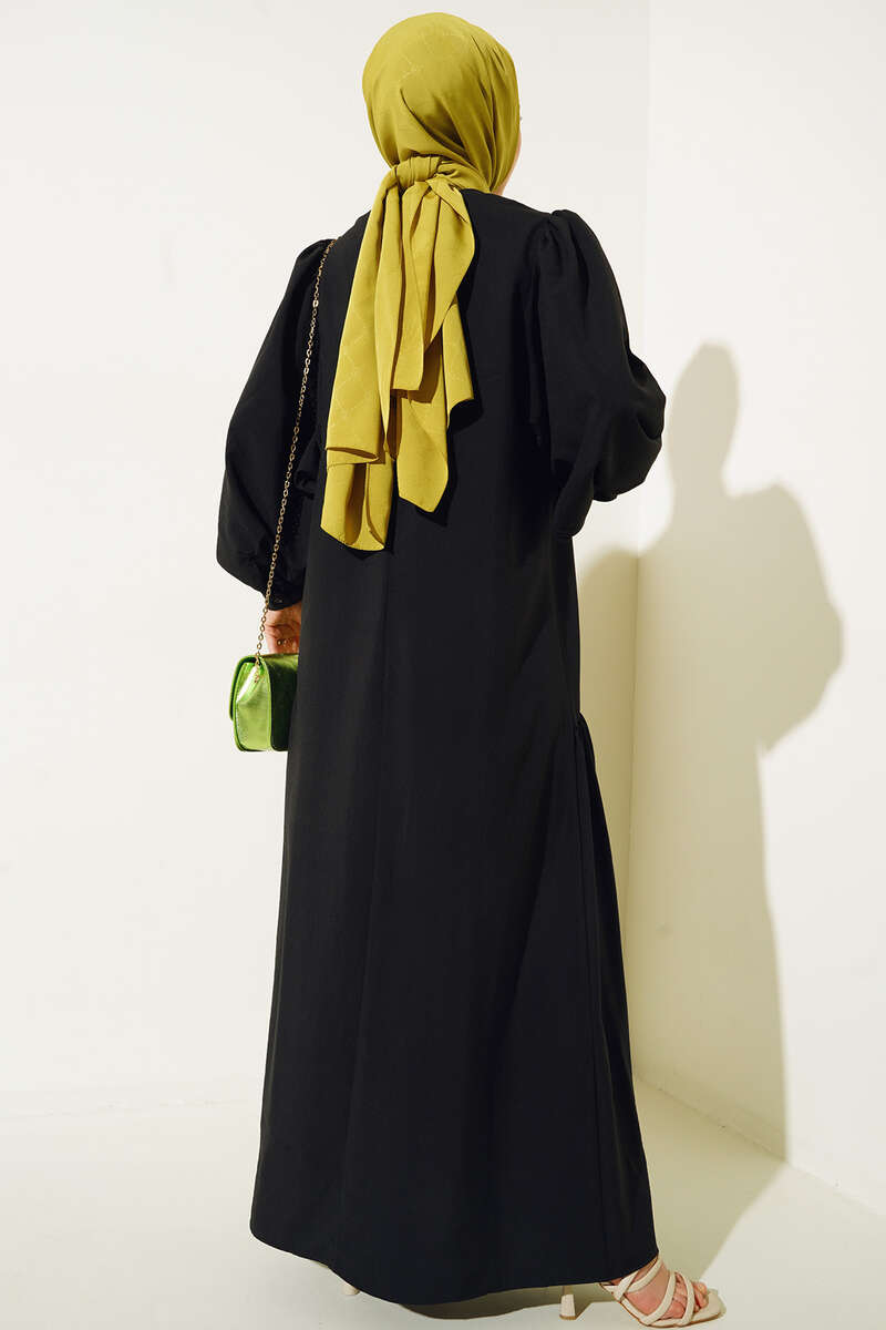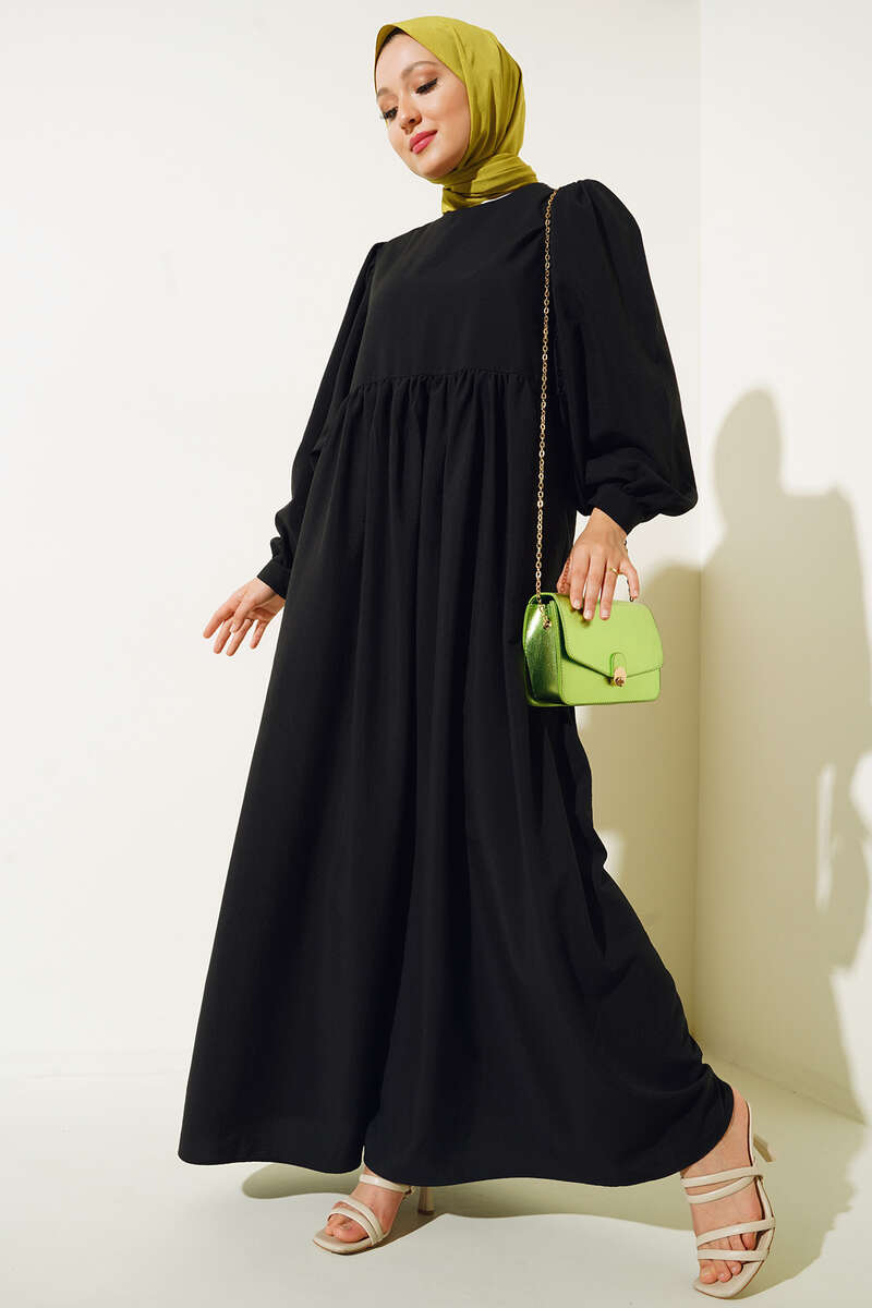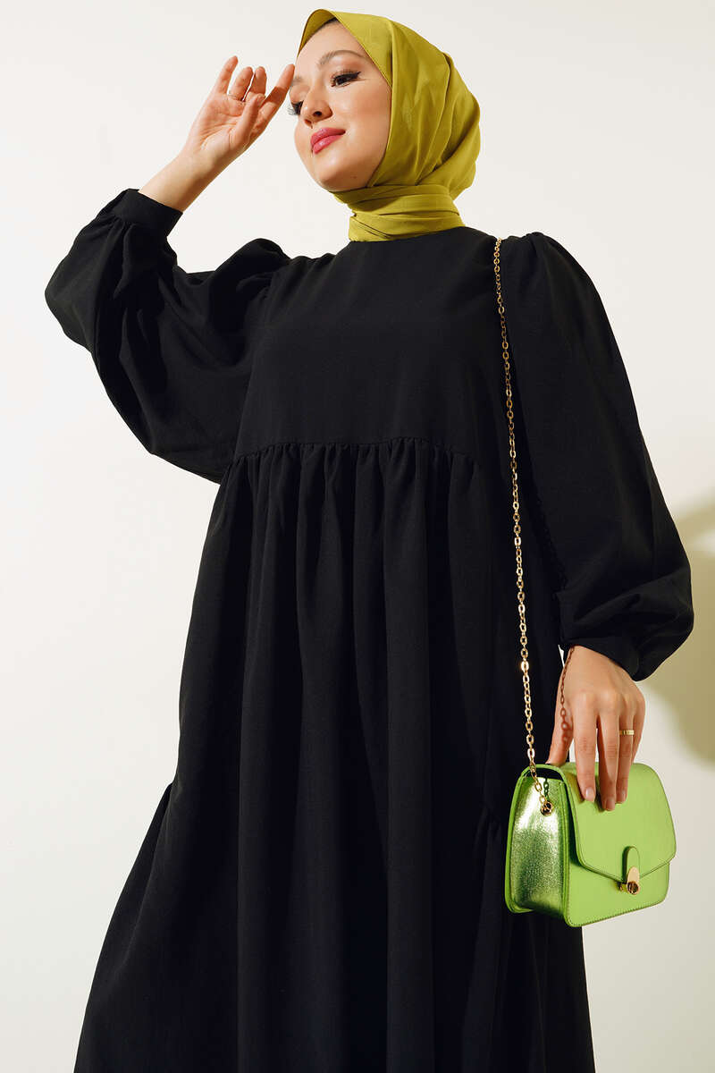 Balon Kol Yanları Büzgülü Elbise Siyah