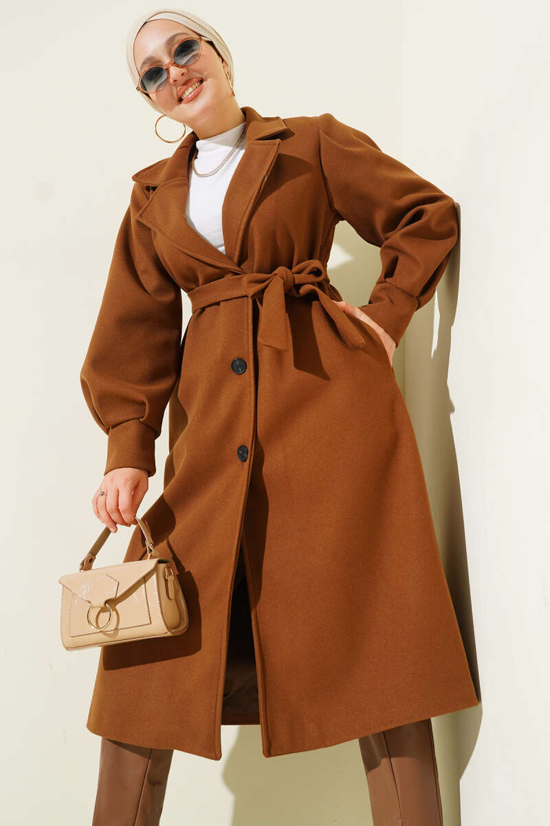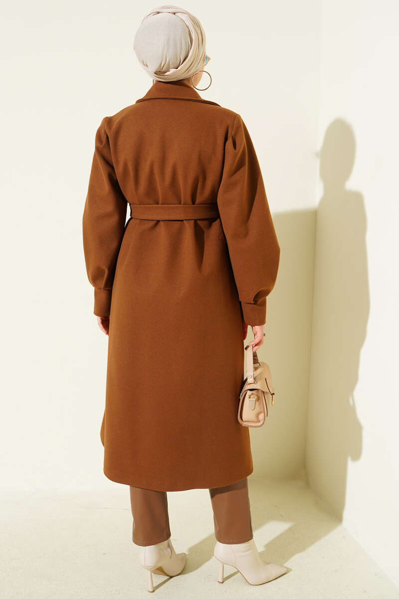 Kuşaklı Kruvaze Yaka Kısa Kaşe Kaban Füme