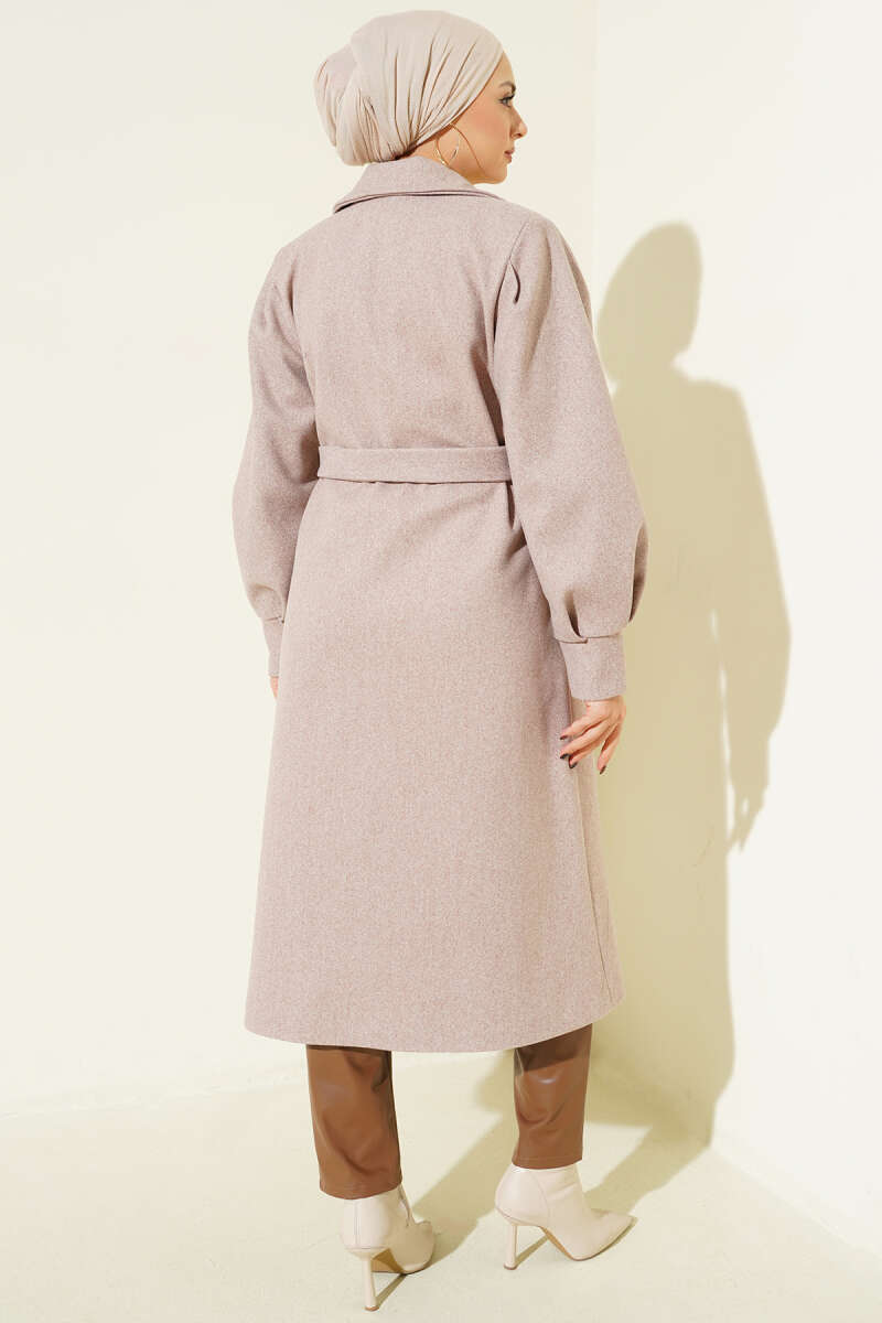 Bel Kuşaklı Astarlı Kaşe Kaban Vizon