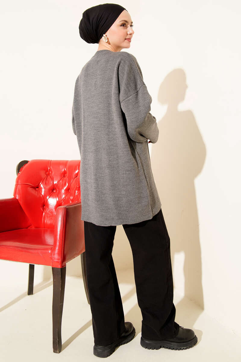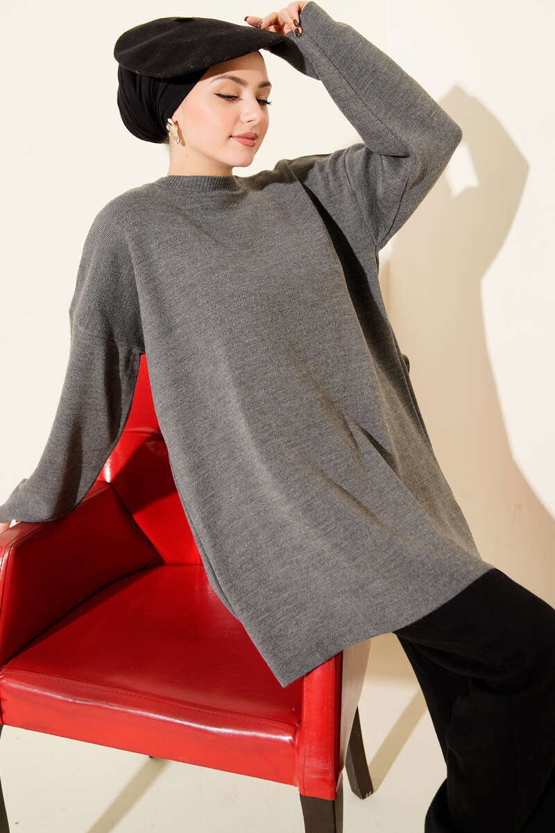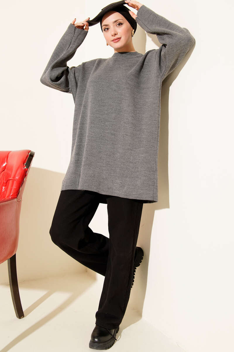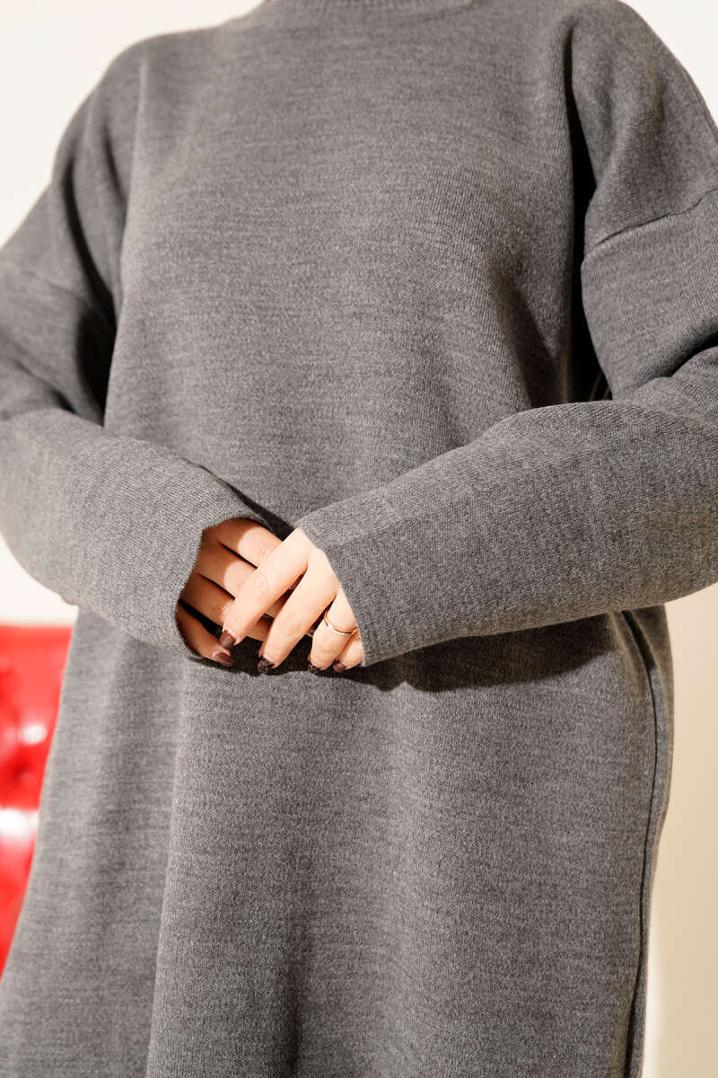 Basic Bisiklet Yaka Düz Triko Tunik Gri