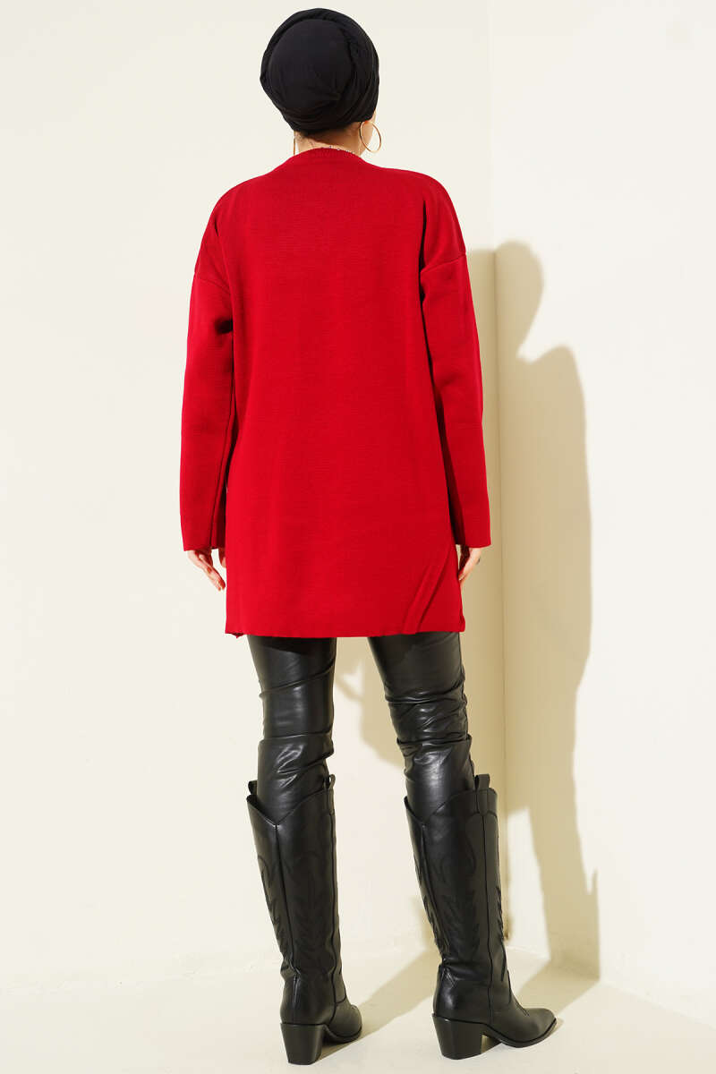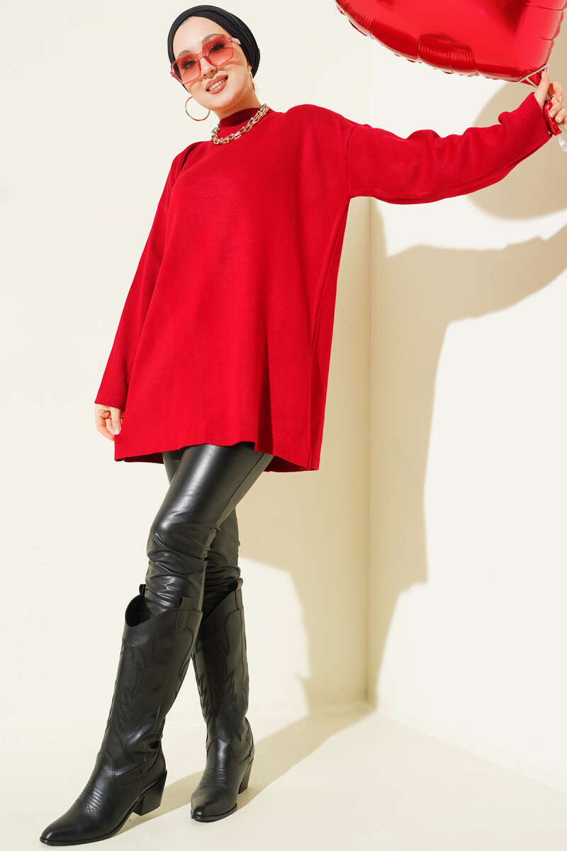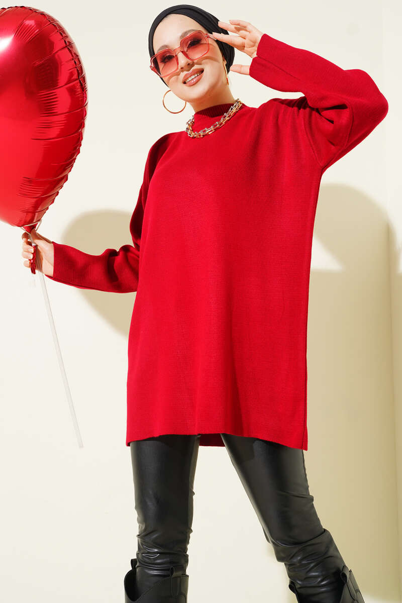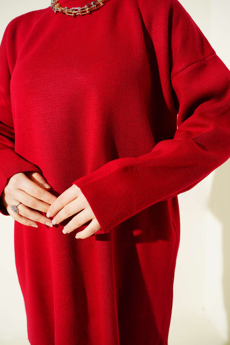 Yaka Fularlı Yumoş Triko Tunik Kırmızı