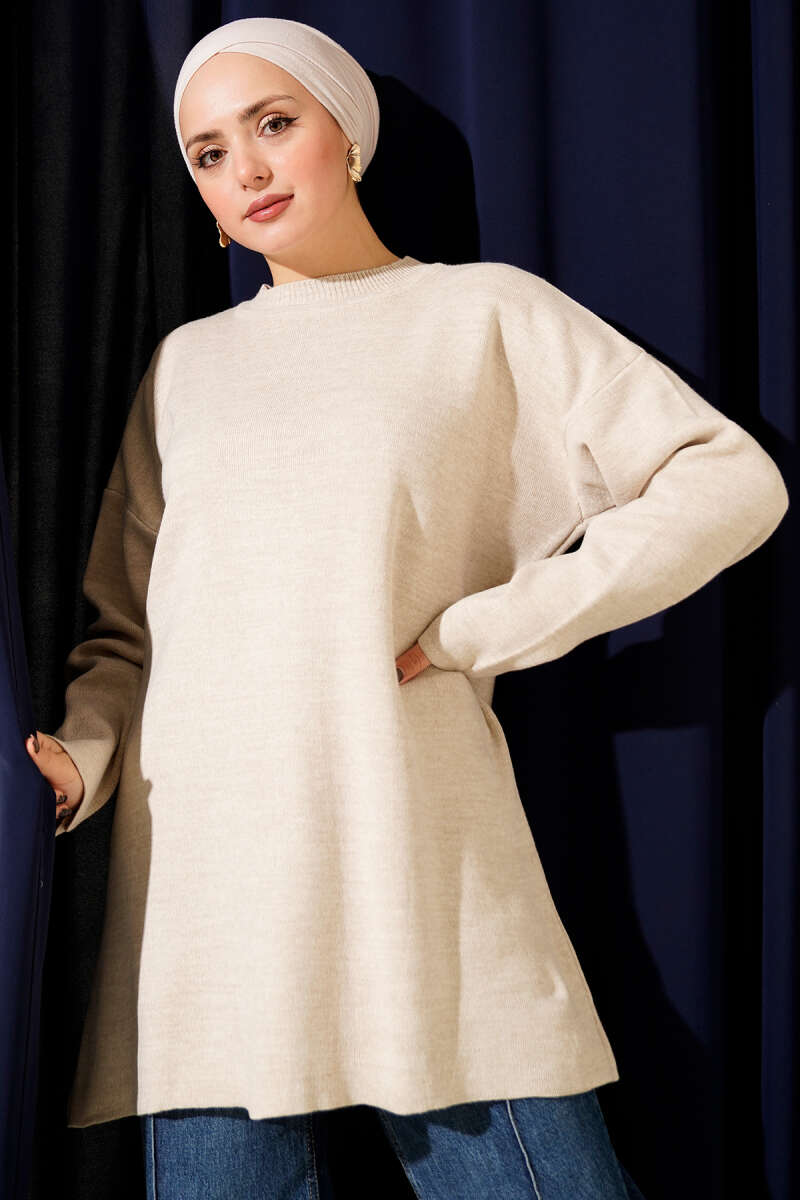 Basic Bisiklet Yaka Düz Triko Tunik Ekru