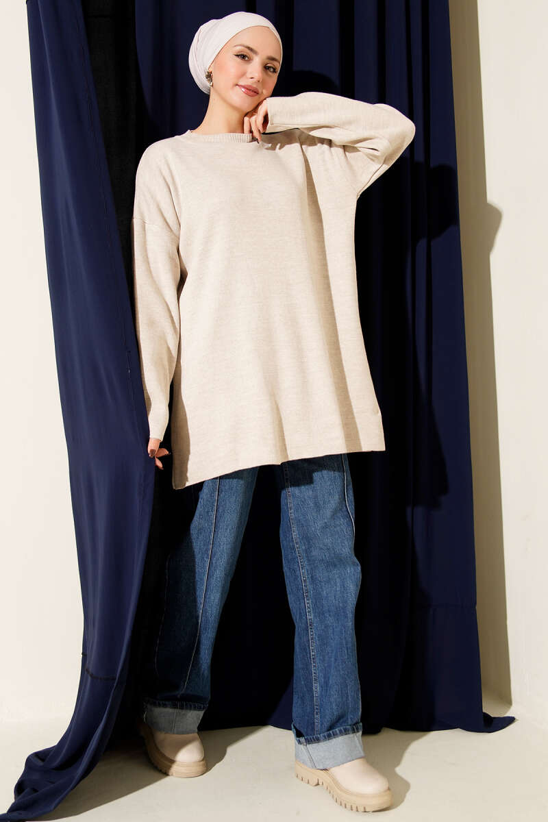 Basic Bisiklet Yaka Düz Triko Tunik Vizon