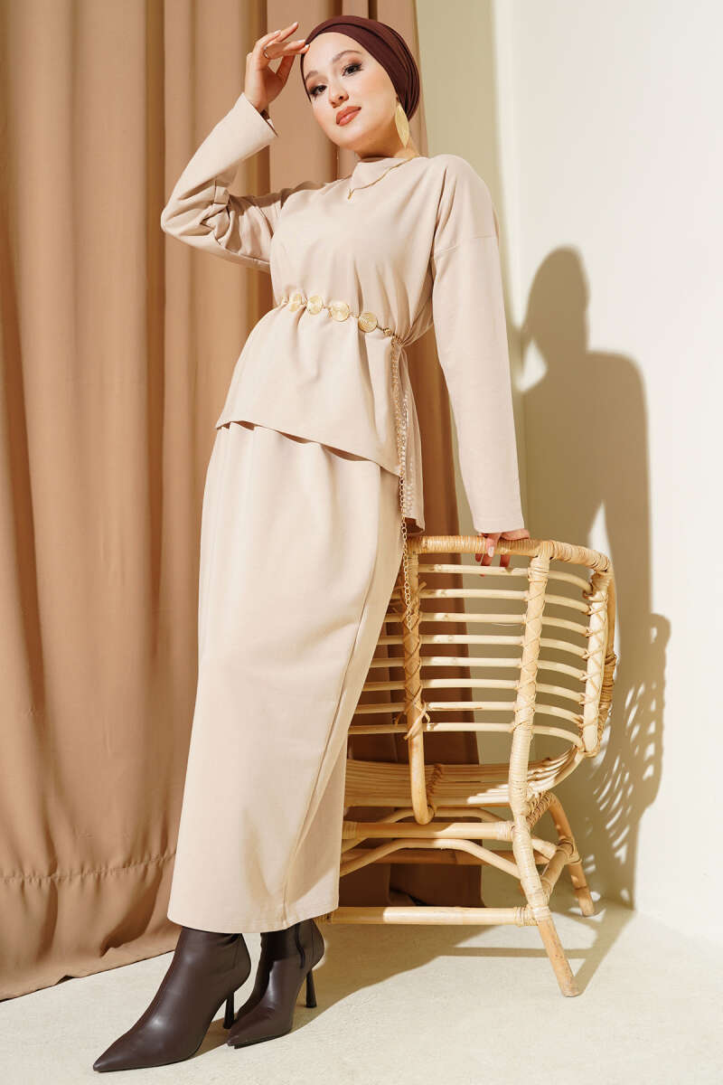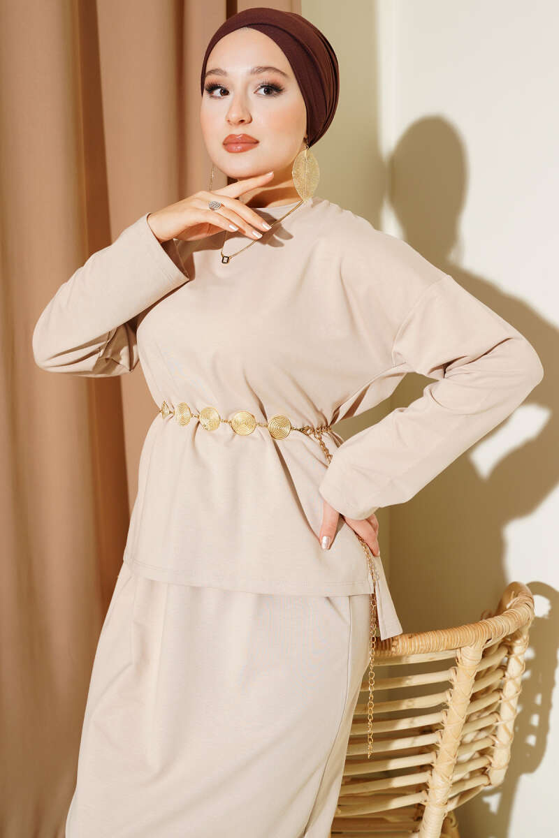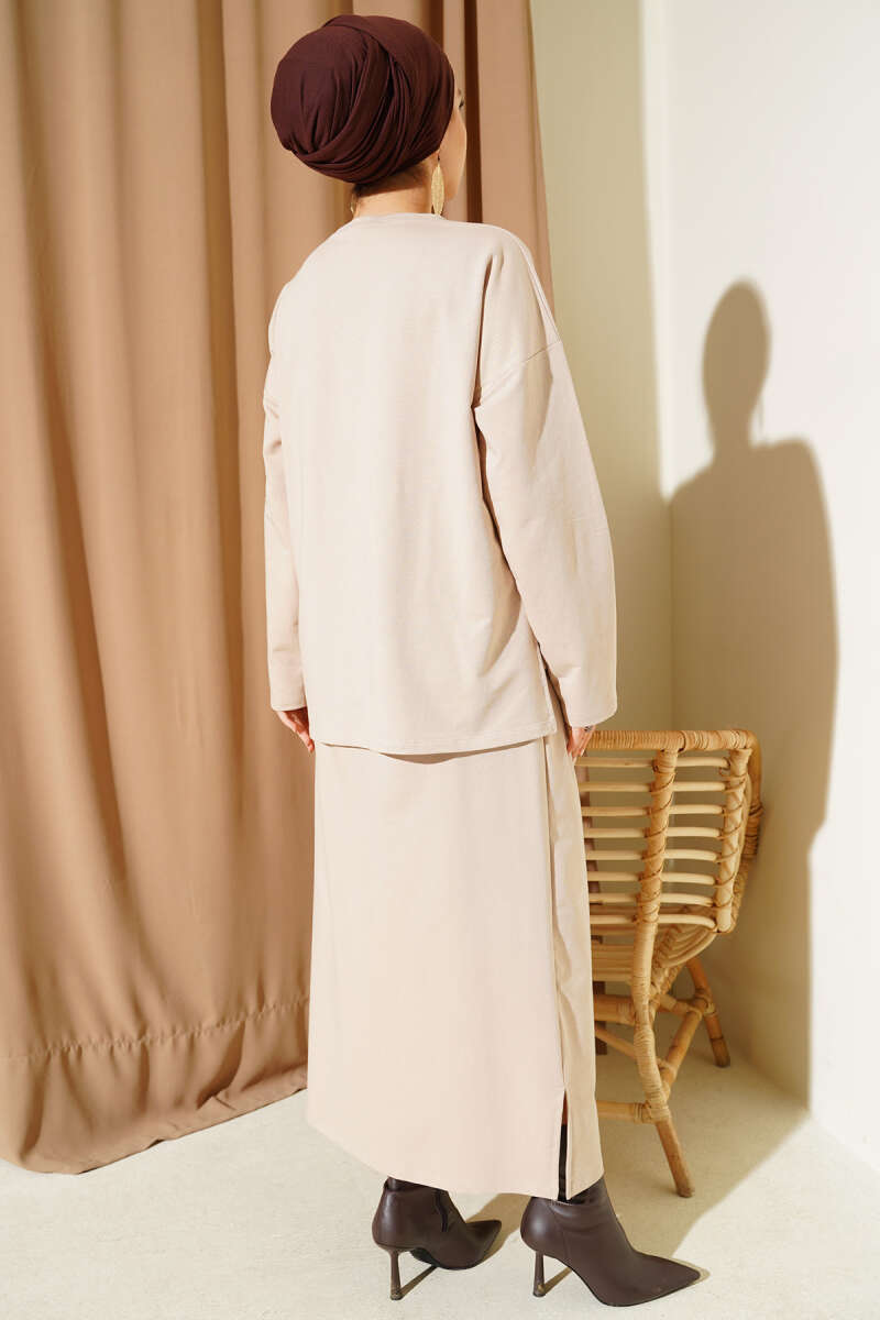 Basic Bisiklet Yaka Etekli İkili Takım Bej