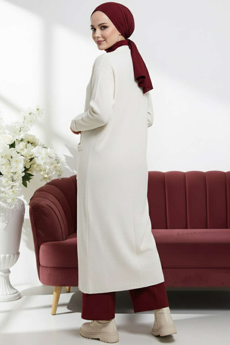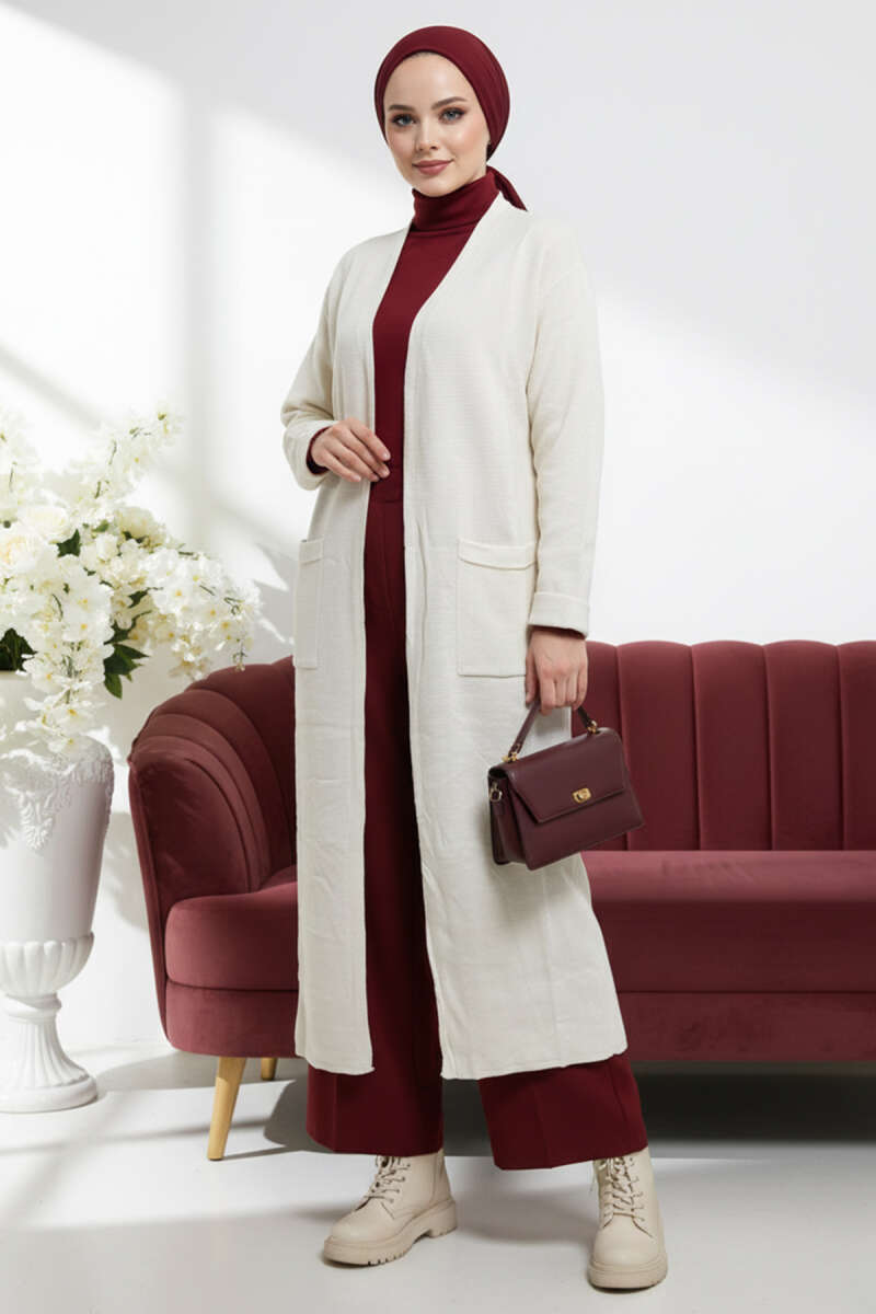 Basic Çift Cepli Uzun Triko Hırka Ekru