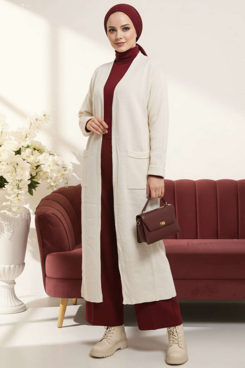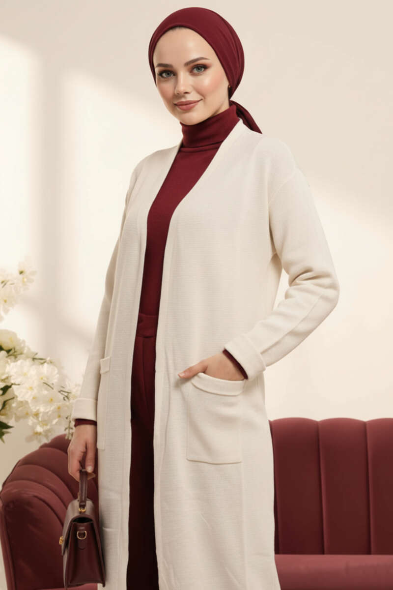 Kol Ucu Düğmeli Şal Yaka Triko Hırka Krem