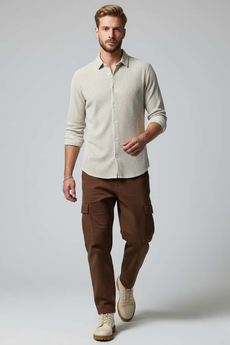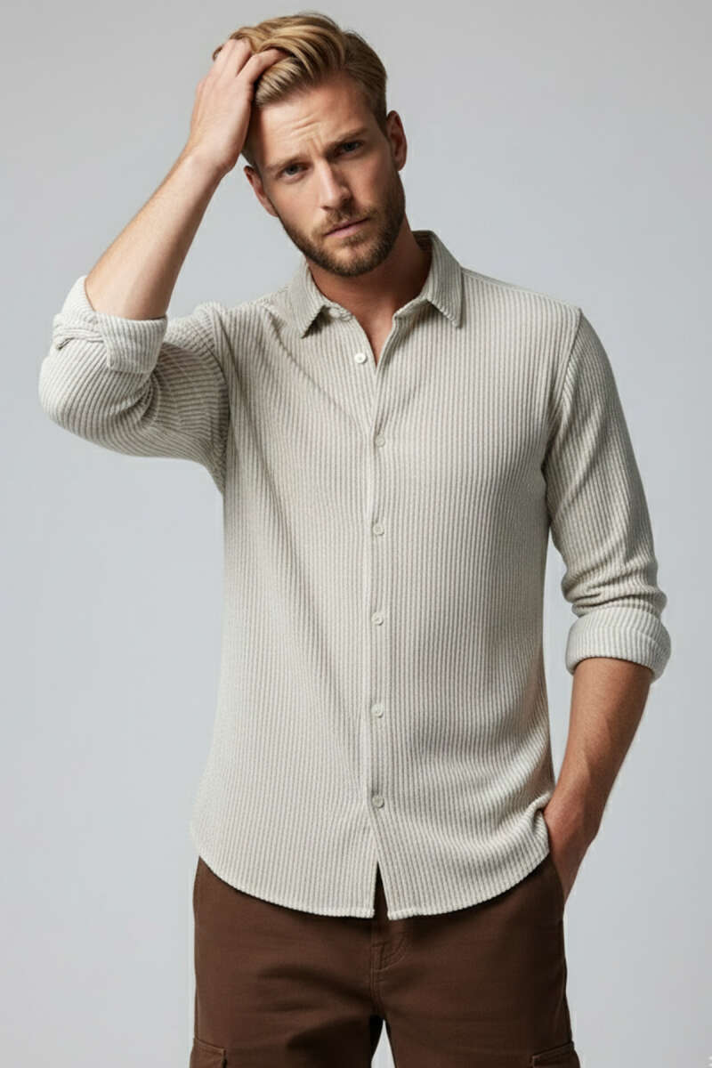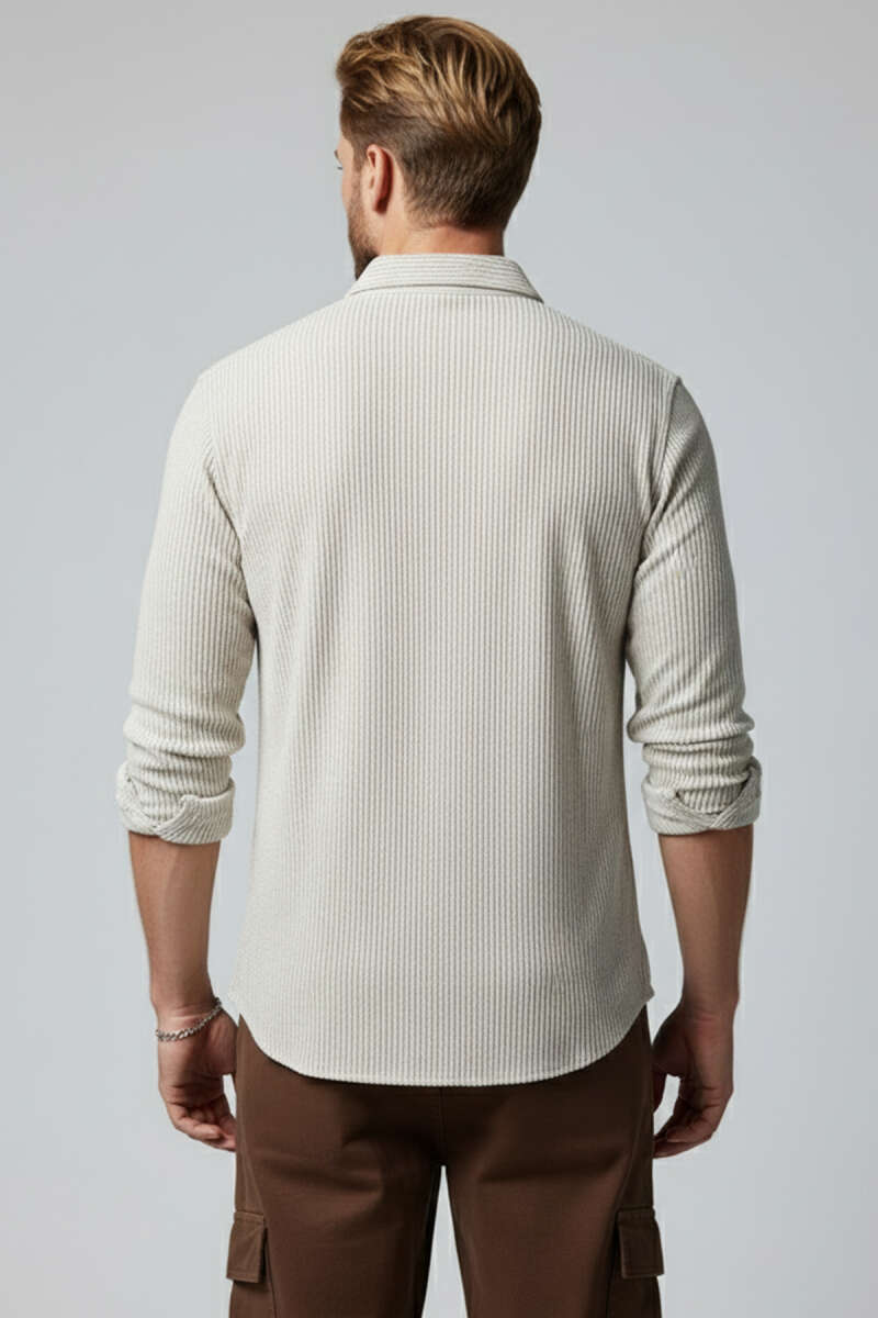 Çizgili Bilek Manşetli Erkek Gömlek Bej