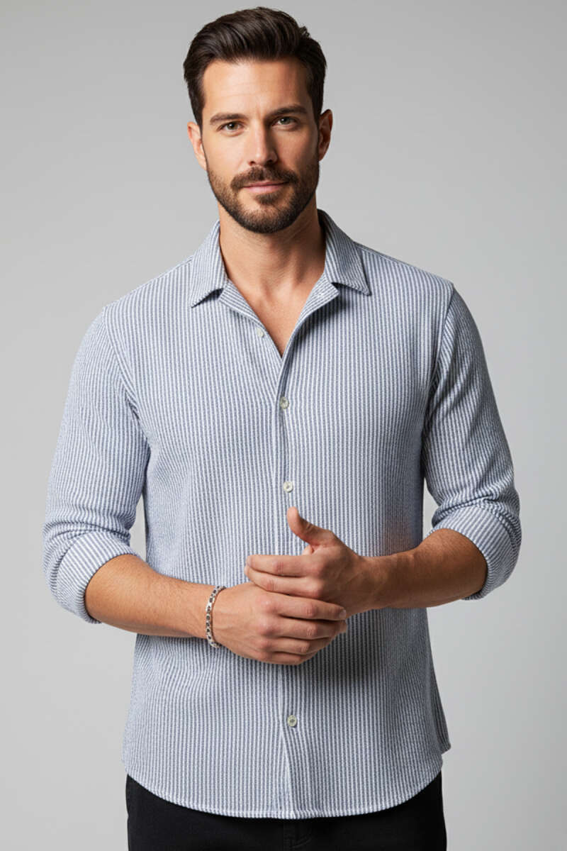 Çizgili Bilek Manşetli Erkek Gömlek Lacivert
