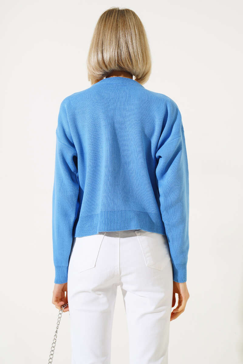 Örgü Detaylı Düğmeli Triko Hırka Saks