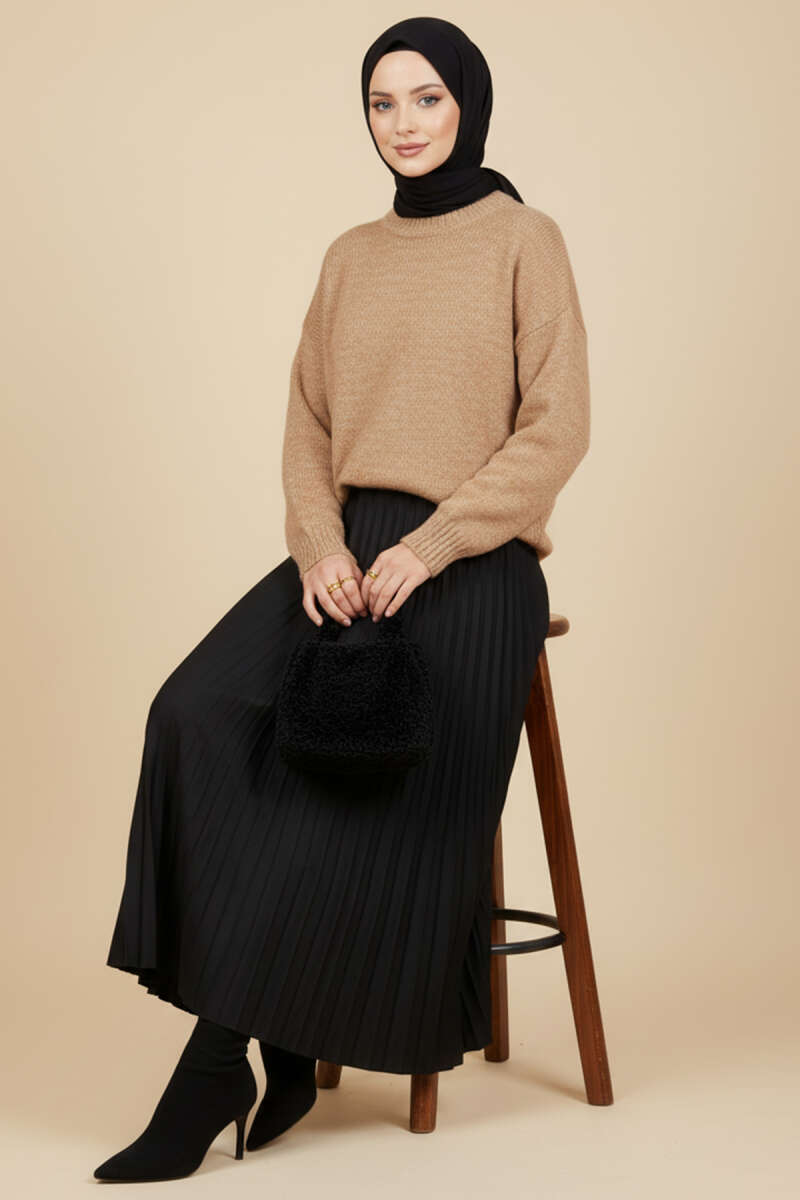 Pileli Düğme Detaylı Örme Triko Elbise Siyah