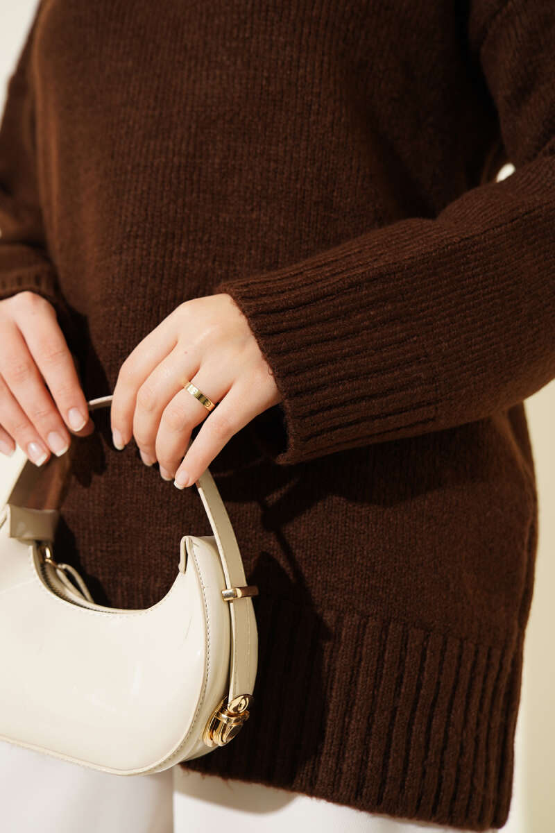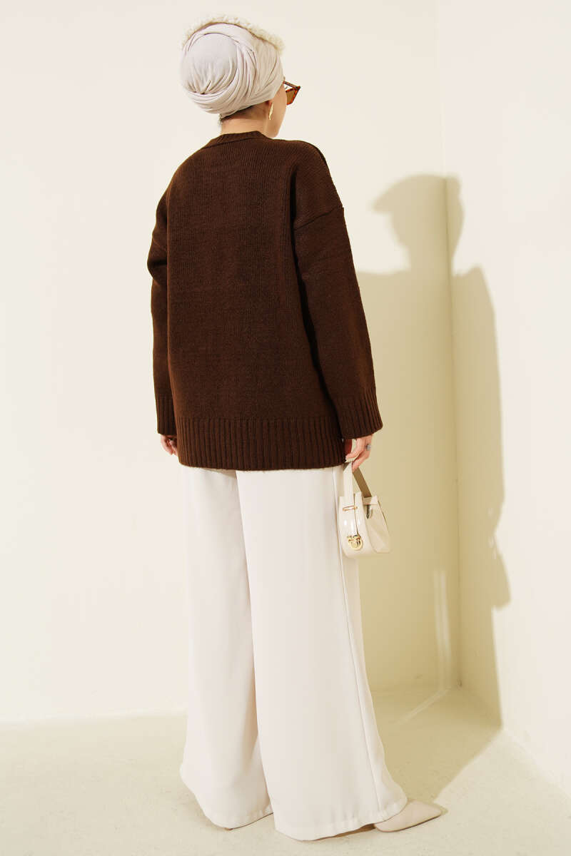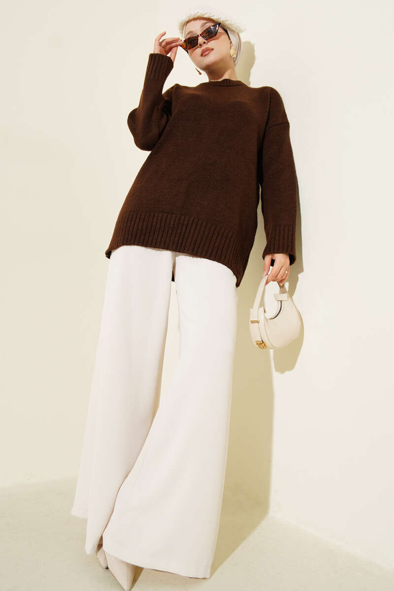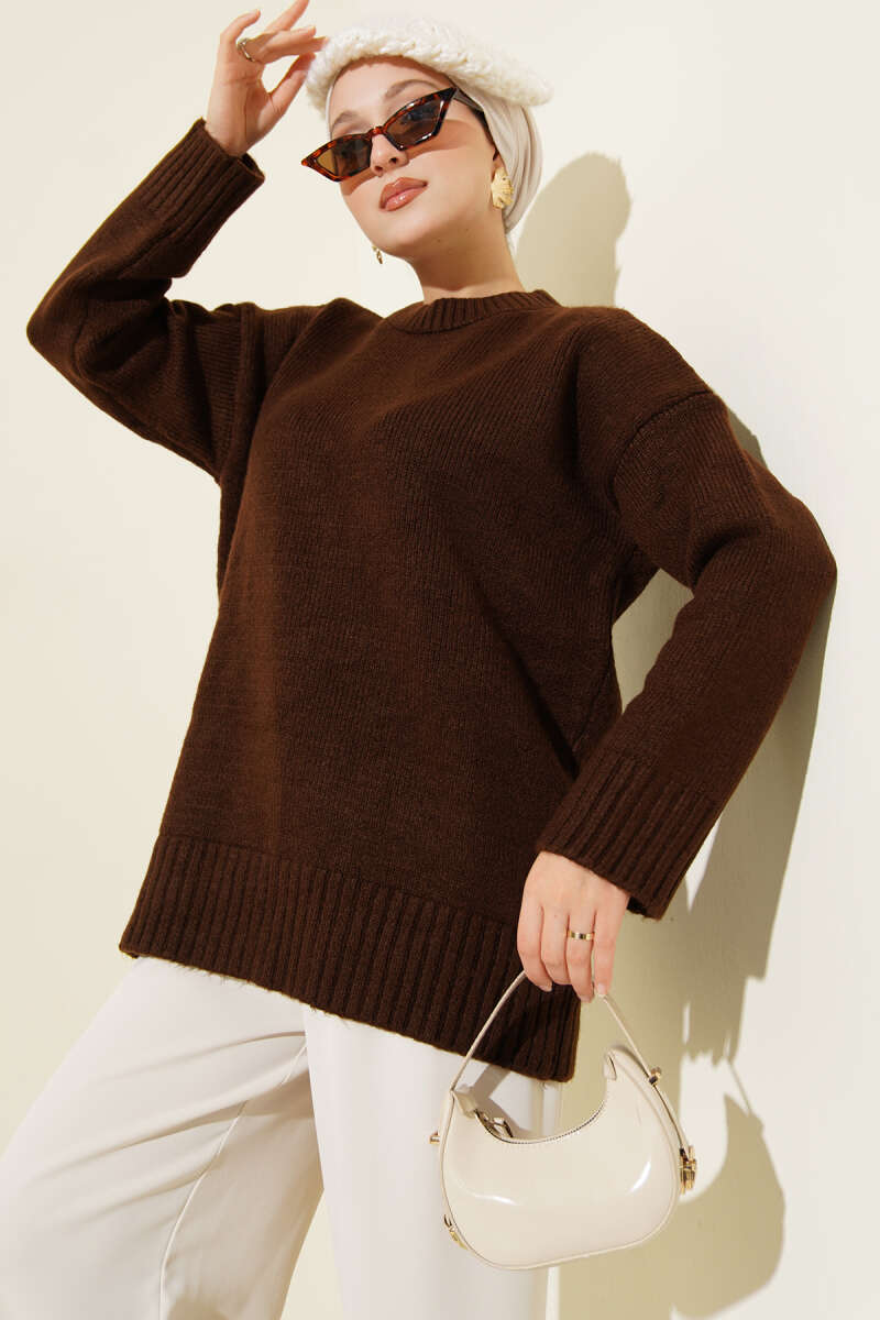 Basic Dikey Çizgi Detaylı Triko Kazak Kahve
