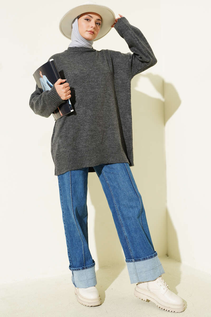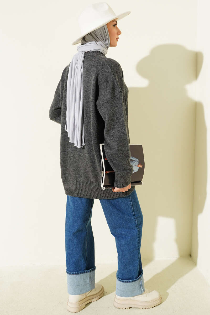 Deri Biyeli Fitilli Görünümlü Kimono Antrasit