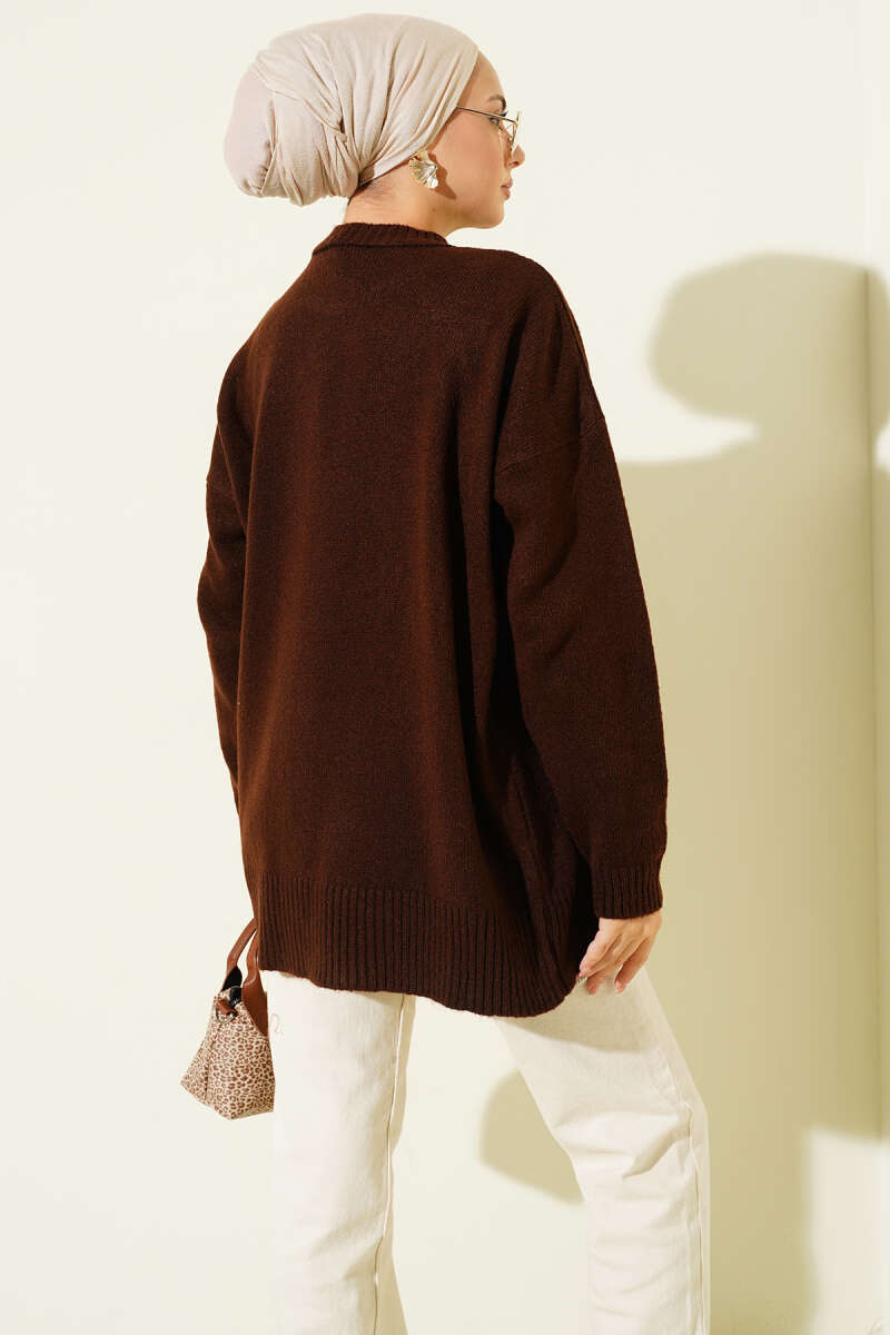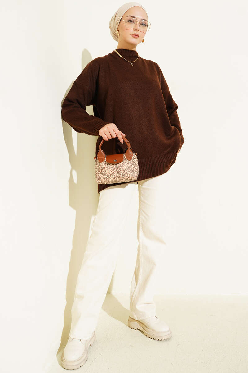 Yatay Çizgili Düşük Omuz Triko Tunik Kahve
