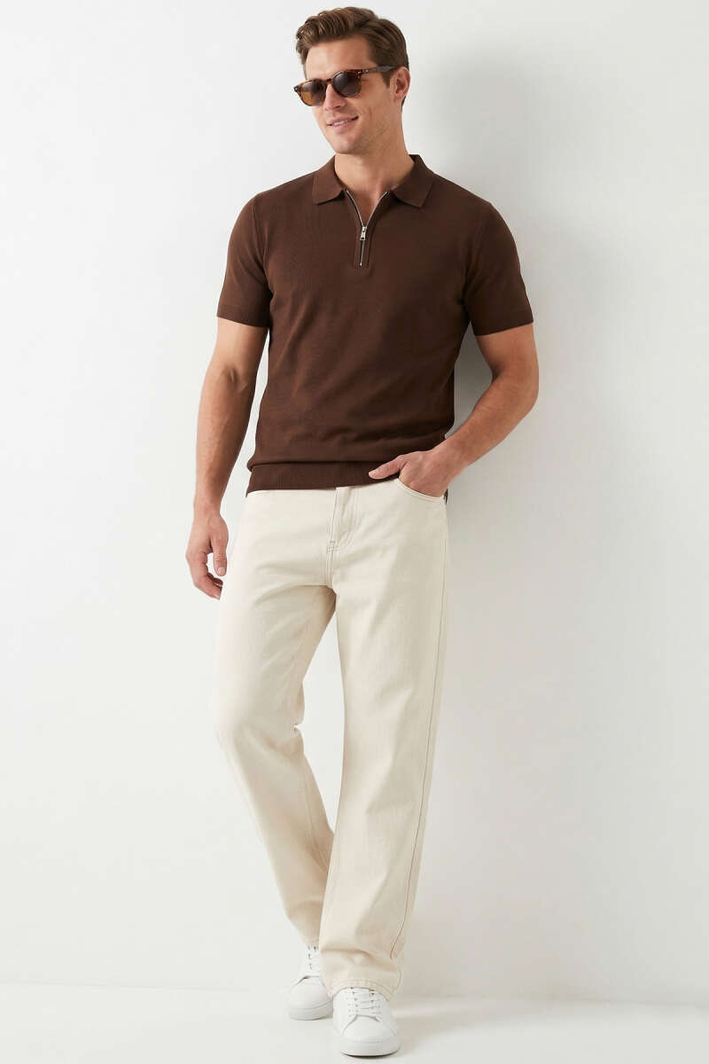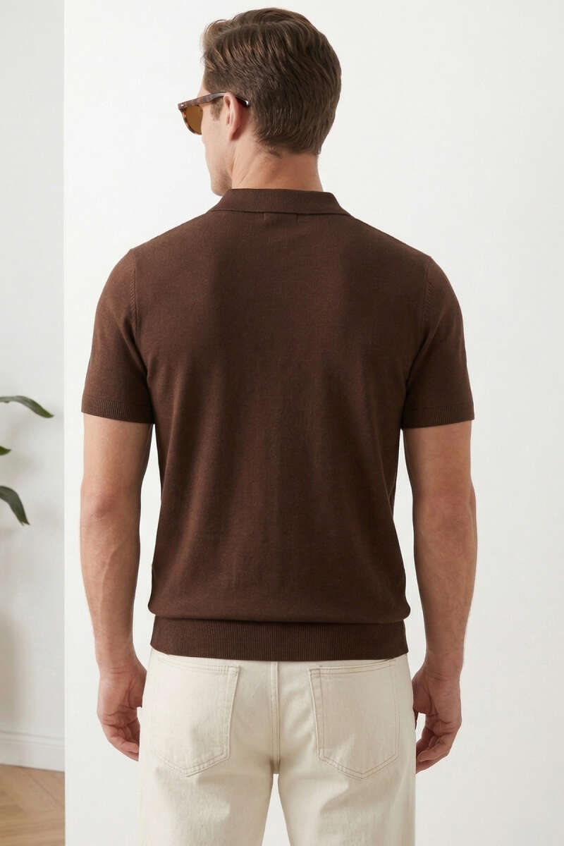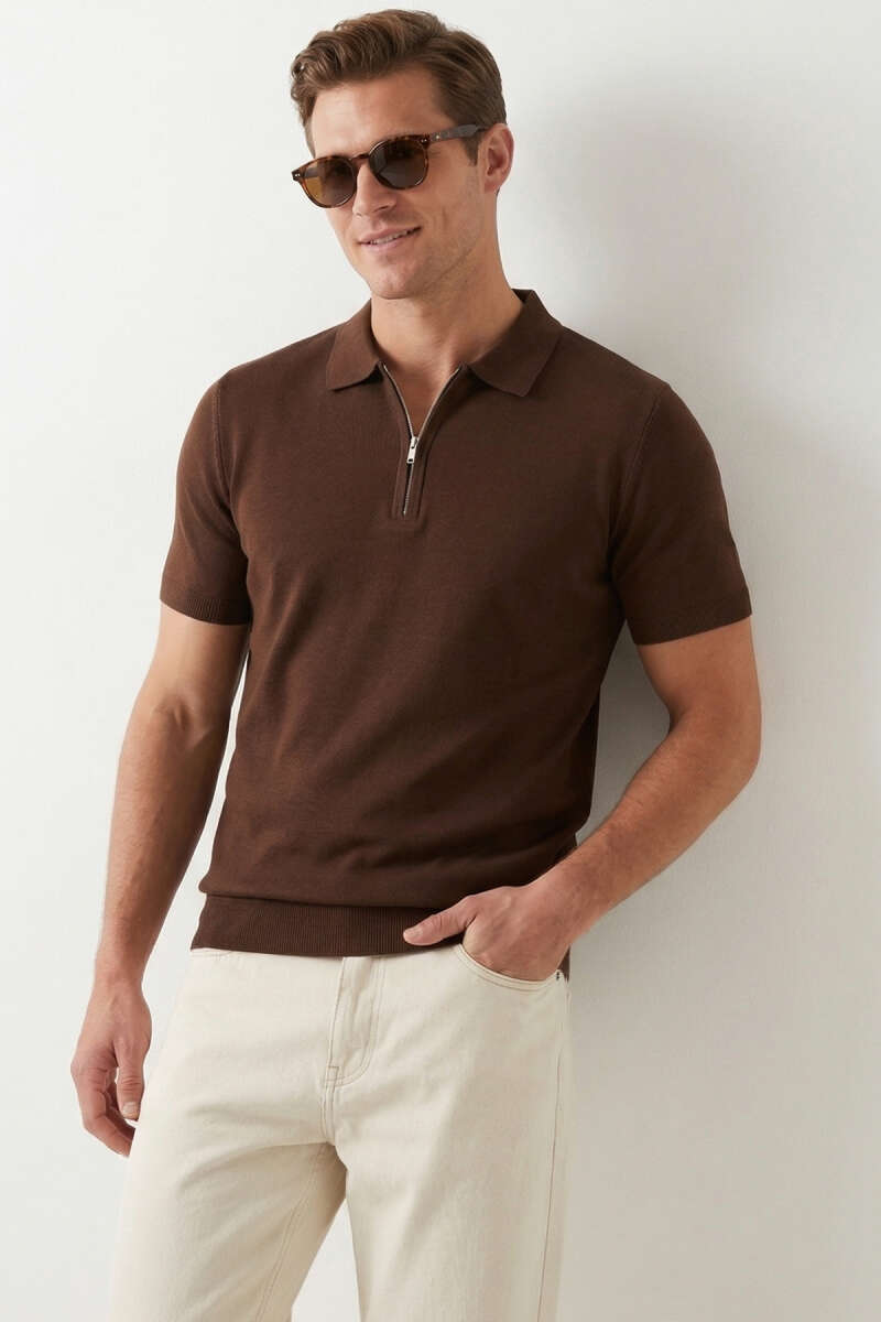 Basic Fermuarlı Merserize Erkek T-shirt Kahve