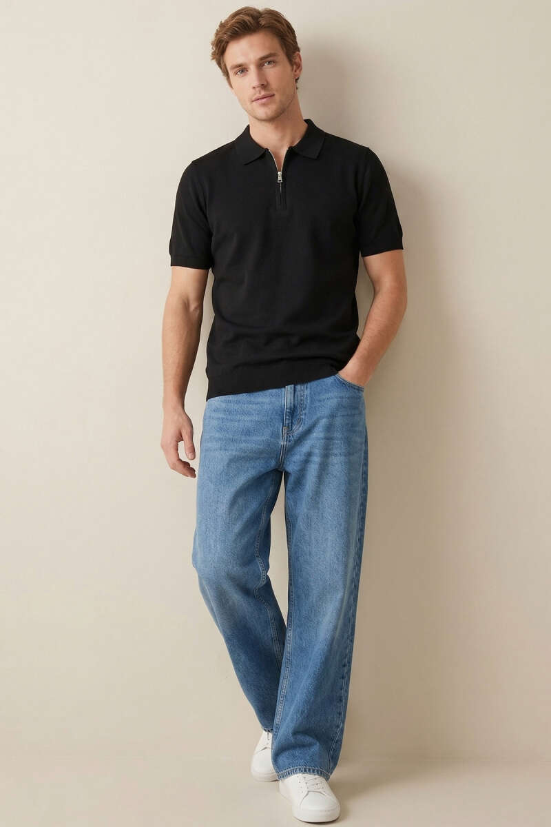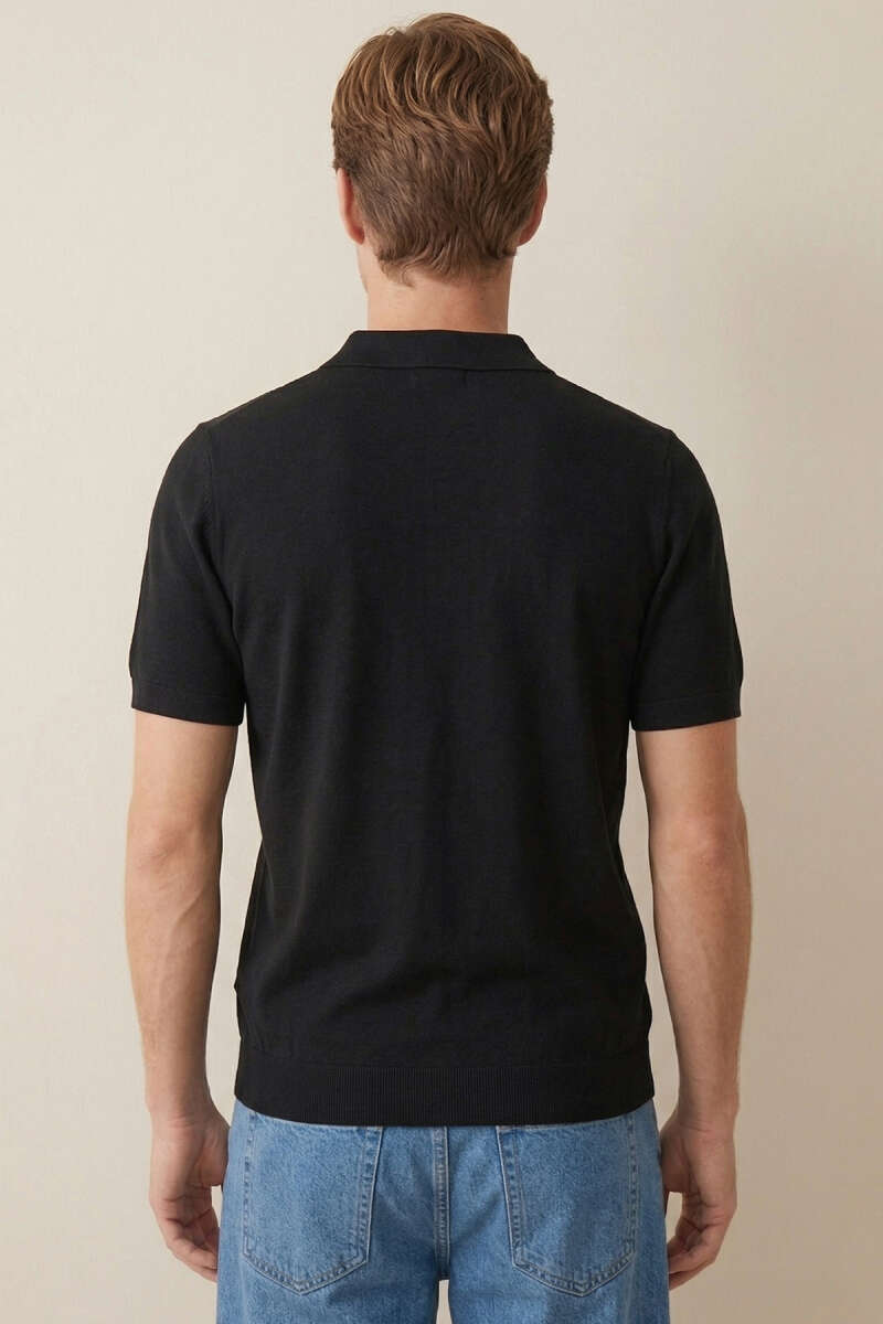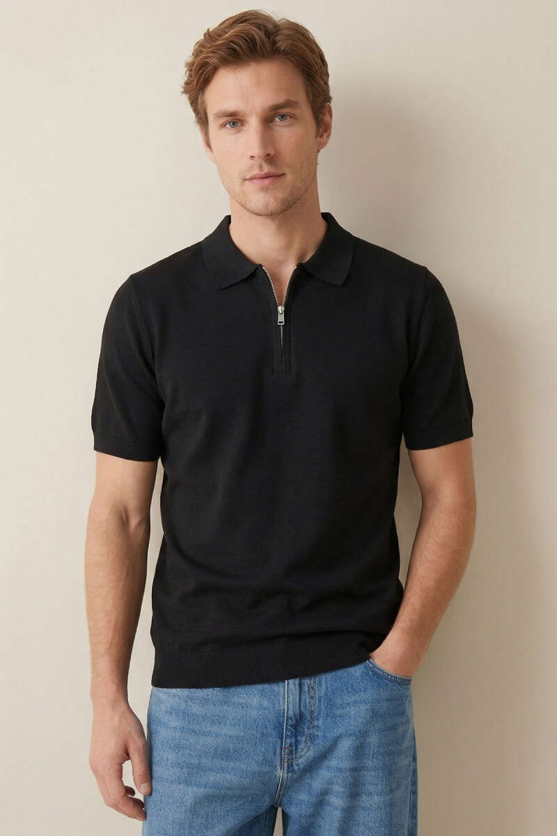 Basic Fermuarlı Merserize Erkek T-shirt Siyah