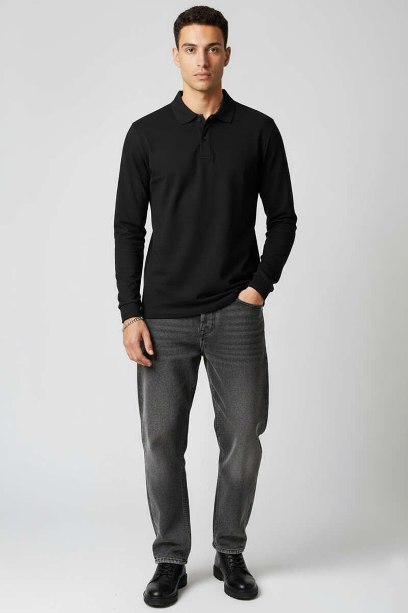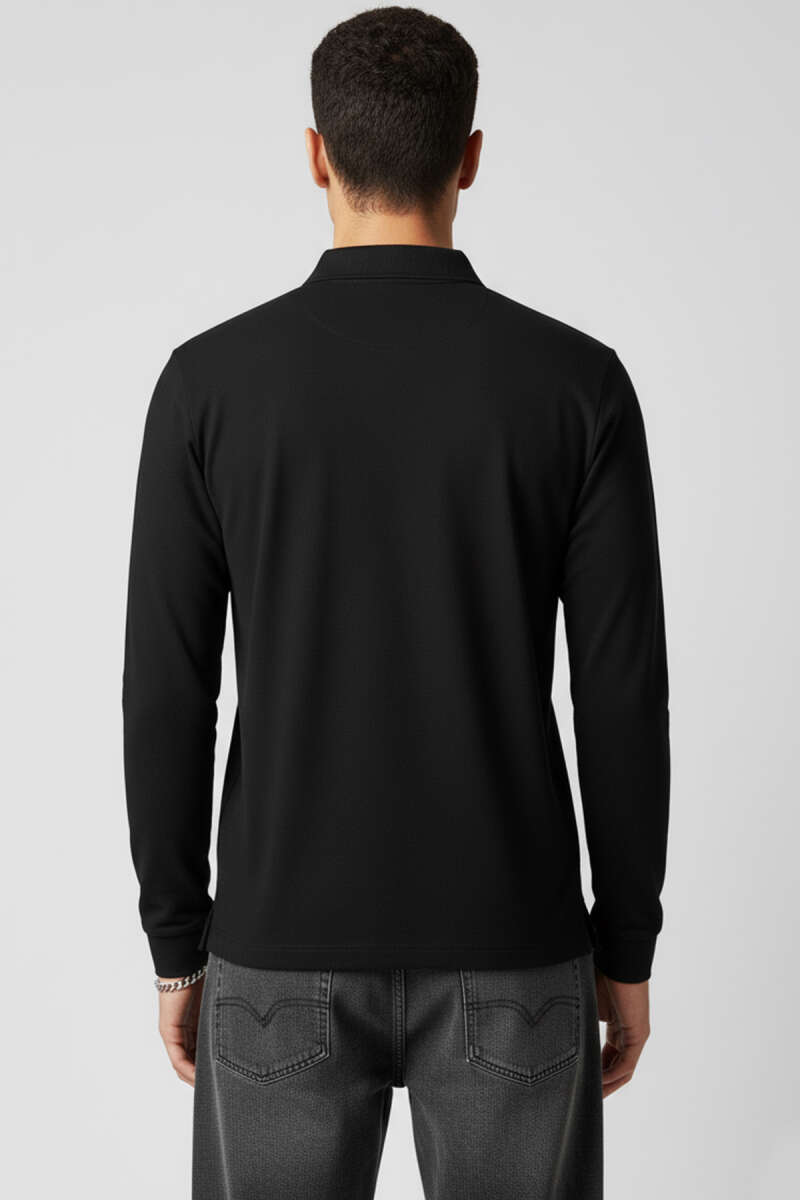 Basic Polo Yaka Uzun Kollu Sweatshirt Siyah