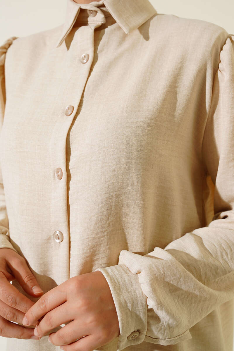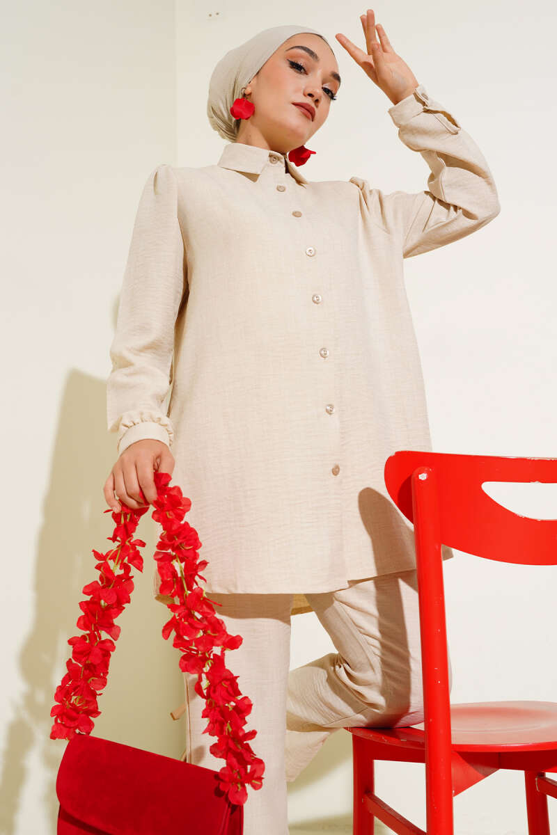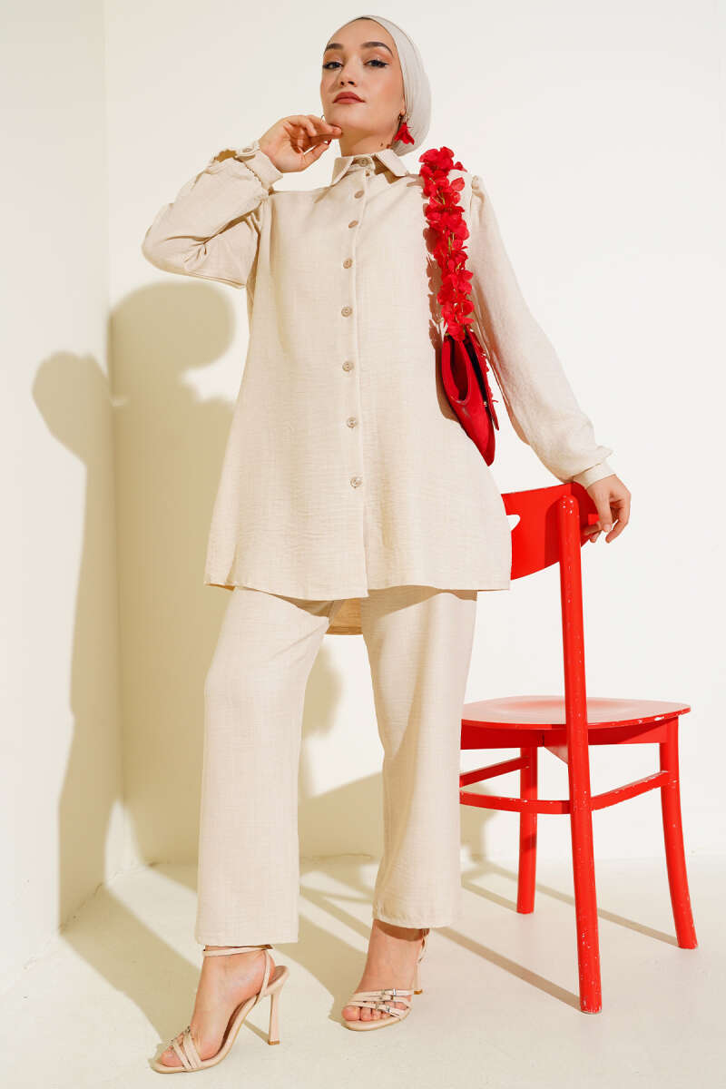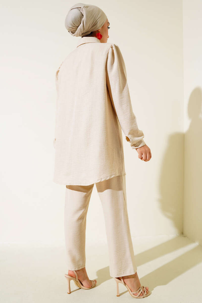 Önü Bağcık Detaylı Etekli İkili Takım Bej