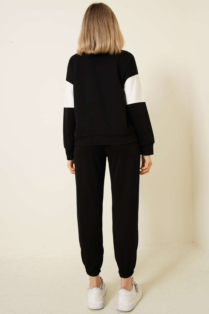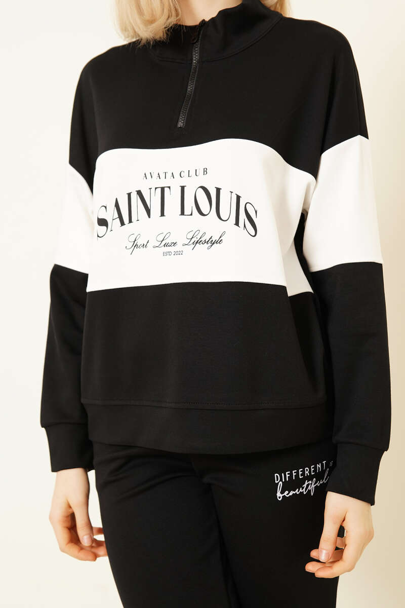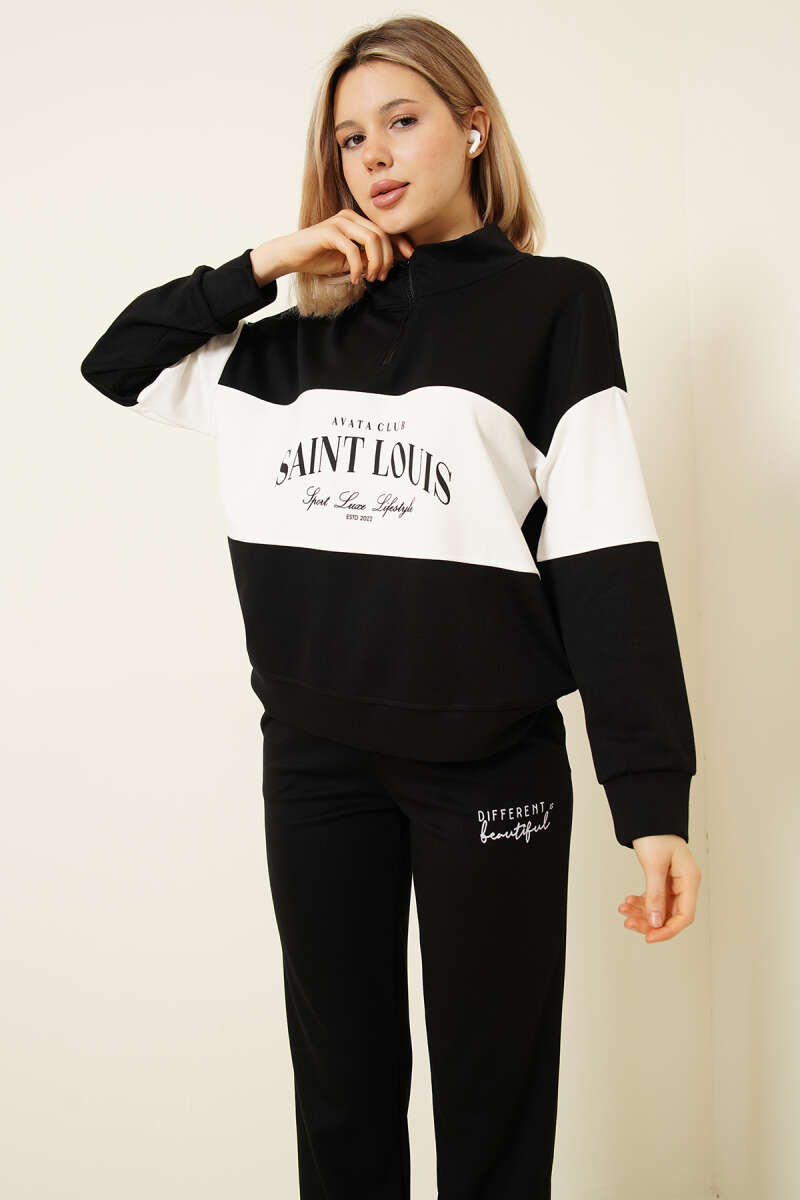 Baskılı Yaka Fermuarlı Sweat İkili Takım Siyah
