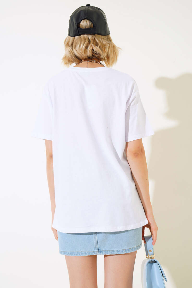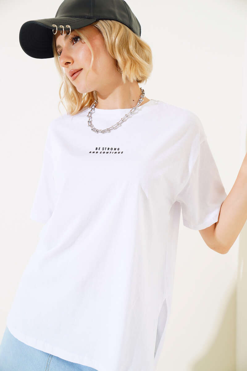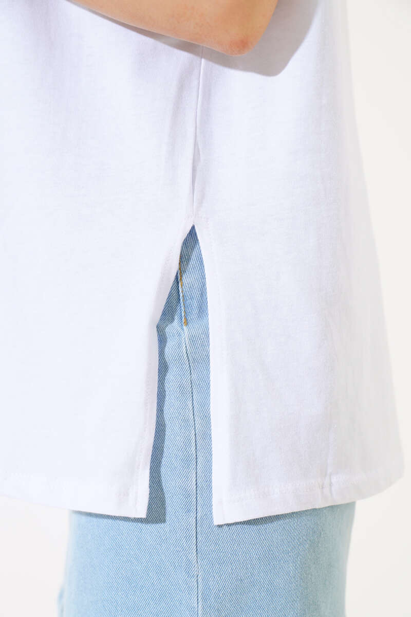 Baskılı Yan Yırtmaçlı T-shirt Beyaz