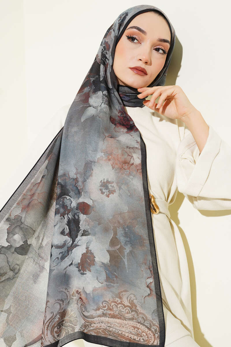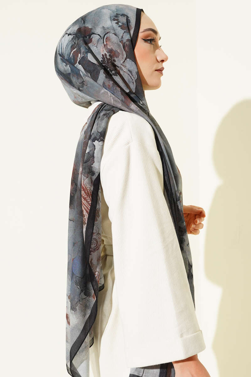 Batik Çiçek Desen Rami Şal Siyah