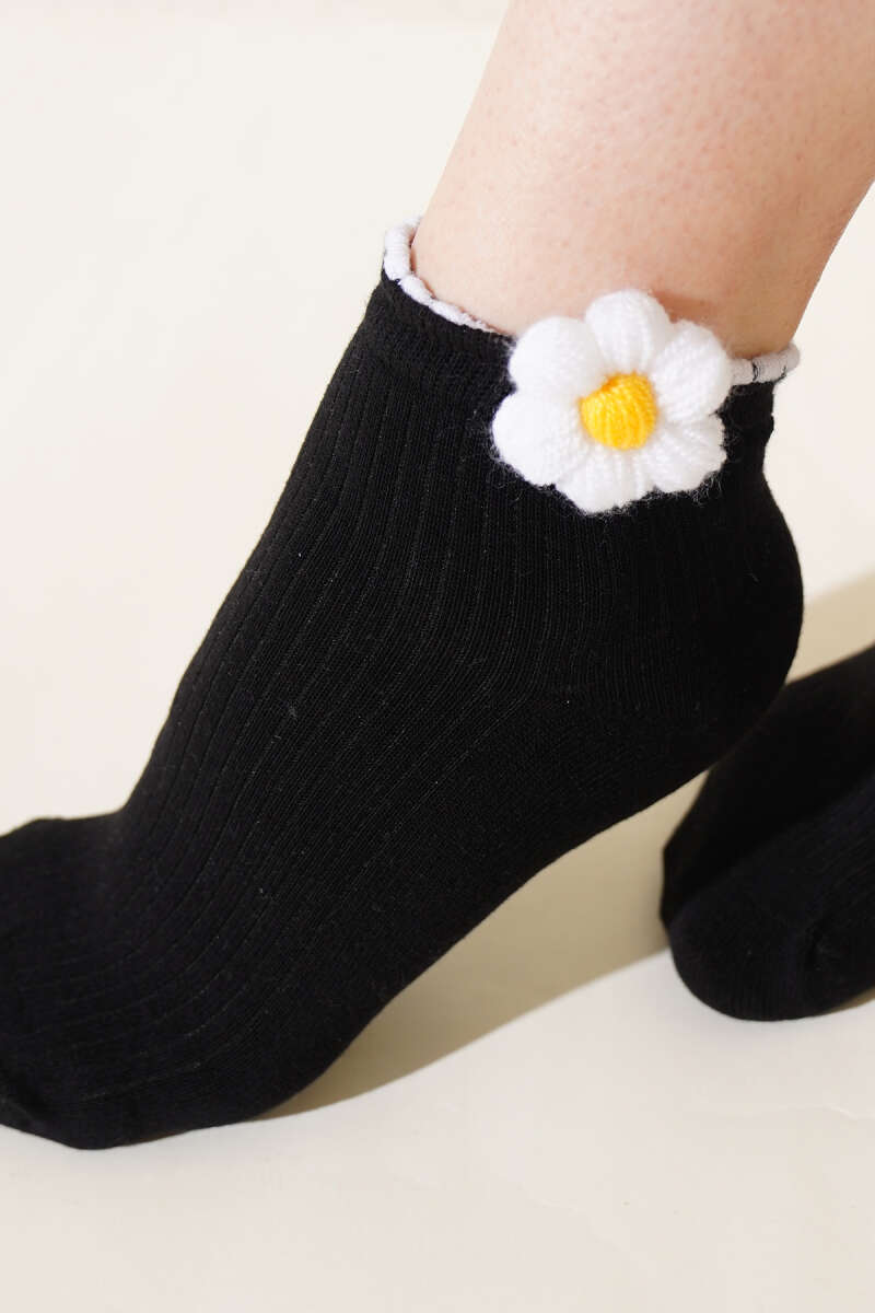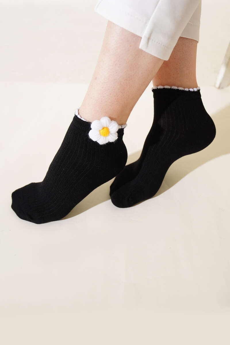 Bayan Papatyalı Soket Çorap Siyah